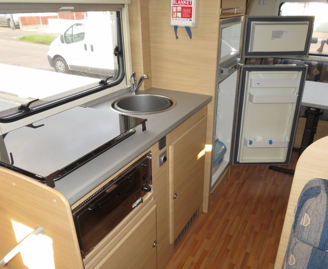 Moving forward you have a double seater dinette at the front of the motorhome, a great place to have breakfast and lunch. The Roller Team has a conservative kitchen with gas hob with three burners, grill, sink with mixer tap and most importantly large fridge and separate freezer.