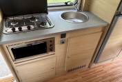 Moving forward you have a double seater dinette at the front of the motorhome, a great place to have breakfast and lunch. The Roller Team has a conservative kitchen with gas hob with three burners, grill, sink with mixer tap and most importantly large fridge and separate freezer.
