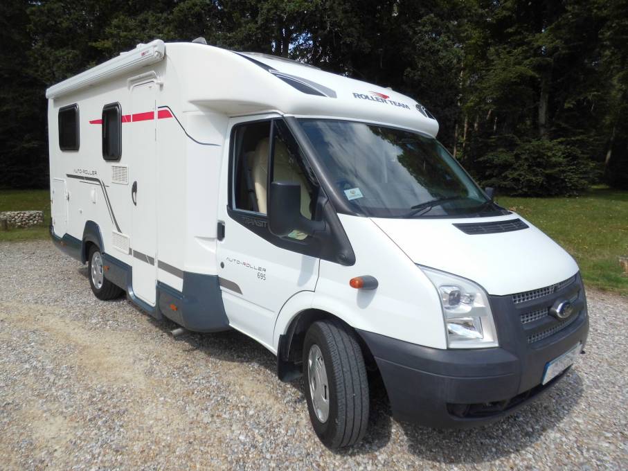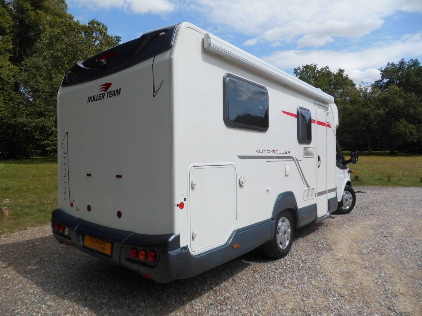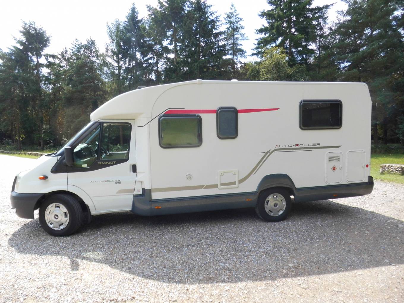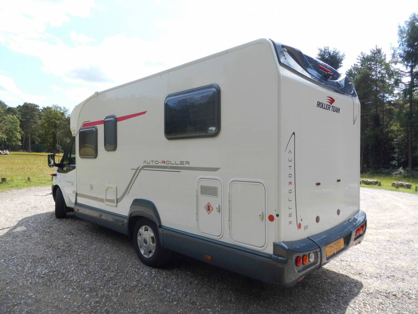 Rollerteam Autoroller 695 3 berth motor home with rear fixed island bed and 4 seat belts with leather upholstery. Built on a Ford chassis with a 2.2cc diesel engine right hand drive, 6 speed manual gearbox. On entering the motor home through a side door, immediately to your left is a lovely kitchen area containing a 3 ring gas hob with a glass lid, a fridge freezer and a sink/worktop area. Moving to the front of the motor home is a spacious lounge area dining table which also converts into a small bed. Both of the front seats swivel making it a perfect socialising area. One of the sofas is front facing with two 3 point seat belts. Moving to the back of the motor home there is a very nice fixed double island bed with storage underneath. To the Left of the bed is a spacious light and modern washroom, consisting of toilet, white gloss, mirror vanity units washbasin and a good size separate shower. Each window has fly screens, blackout blinds. There is ample lighting throughout the motor home making it nice and light. The flooring is a vinyl wood effect flooring and comes with removable carpets. There is a large sunroof in the centre of the habitation area.