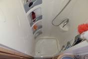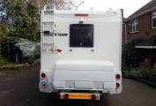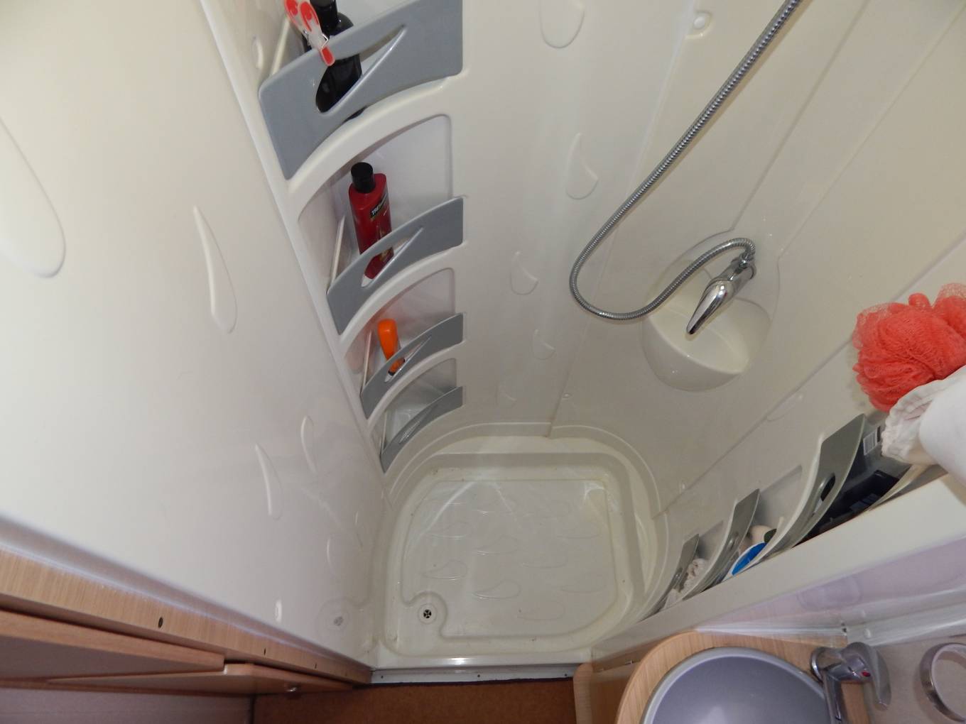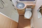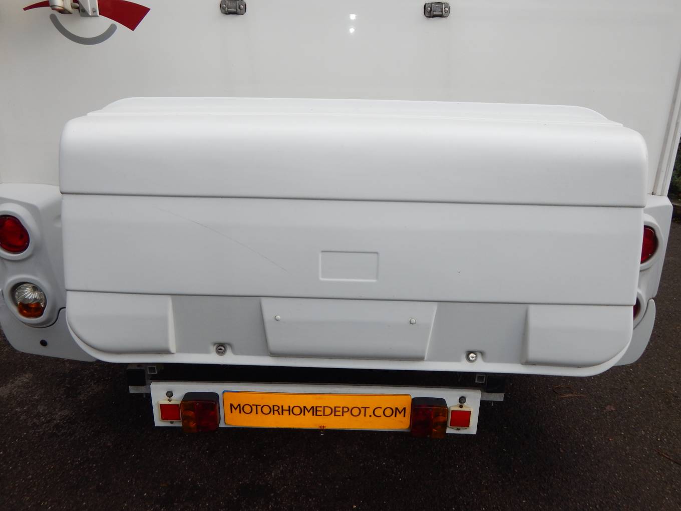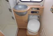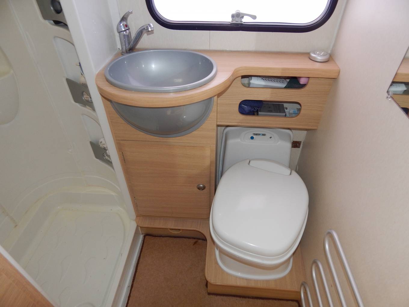 The rear washroom has a separate shower cubicle with shower handset on a rising rail and a shower curtain, a good sized washbasin with chrome mixer tap and a Thetford cassette swivelling toilet with electric flush. Plenty of storage is available with 3 cupboards and clever storage in the shower cubicle.