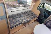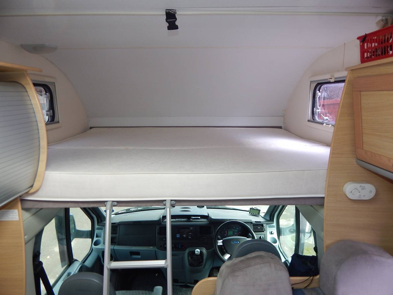 The over-cab bed is cavernous, the biggest I've seen, access is via an aluminium ladder and there is a window each side with reading lights and privacy curtains. During the day the bed lifts up on gas struts to give additional headroom in the cab.