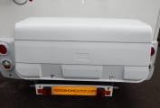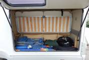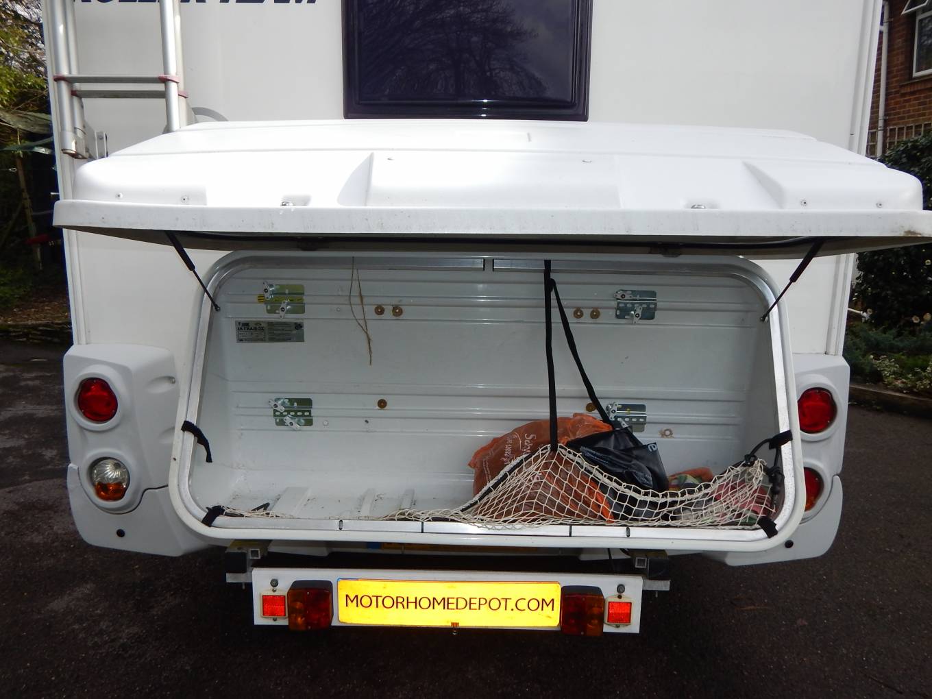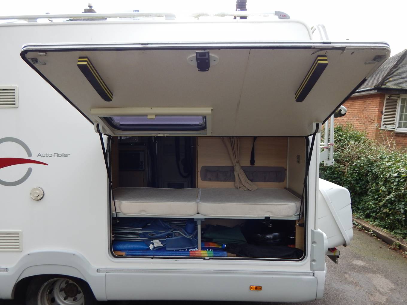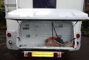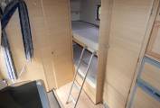 The rear near side has two bunk beds, the top bunk accessed with an aluminium ladder, plus there are reading lights and privacy curtains. The bottom bunk lifts up and there is a very large access door from the outside making a very large storage area whilst travelling.