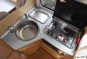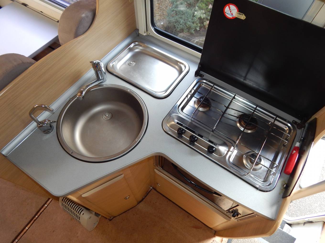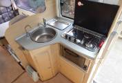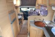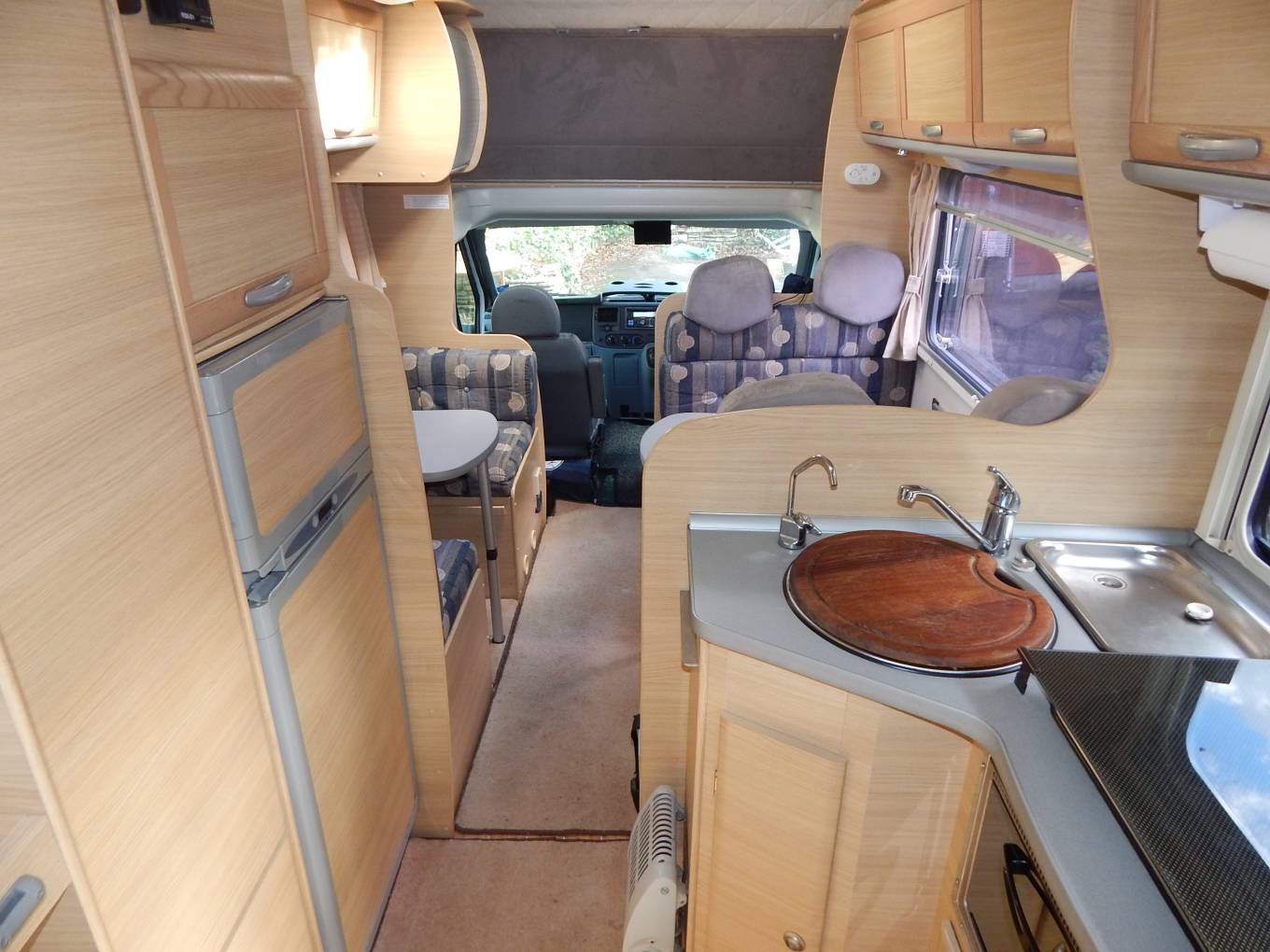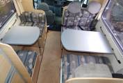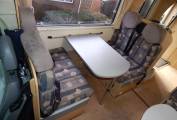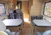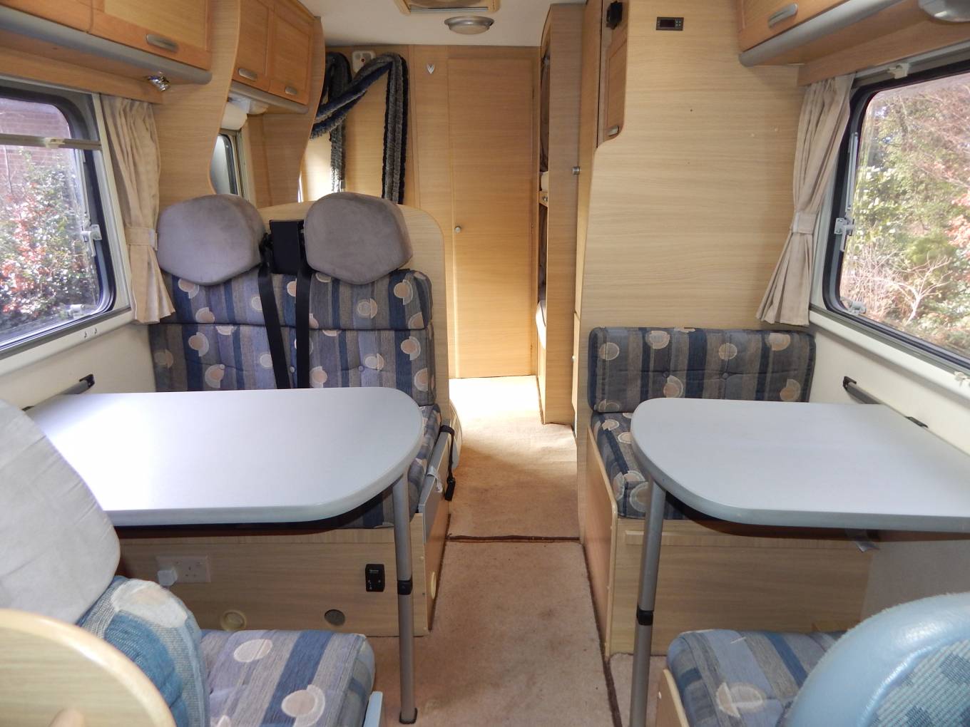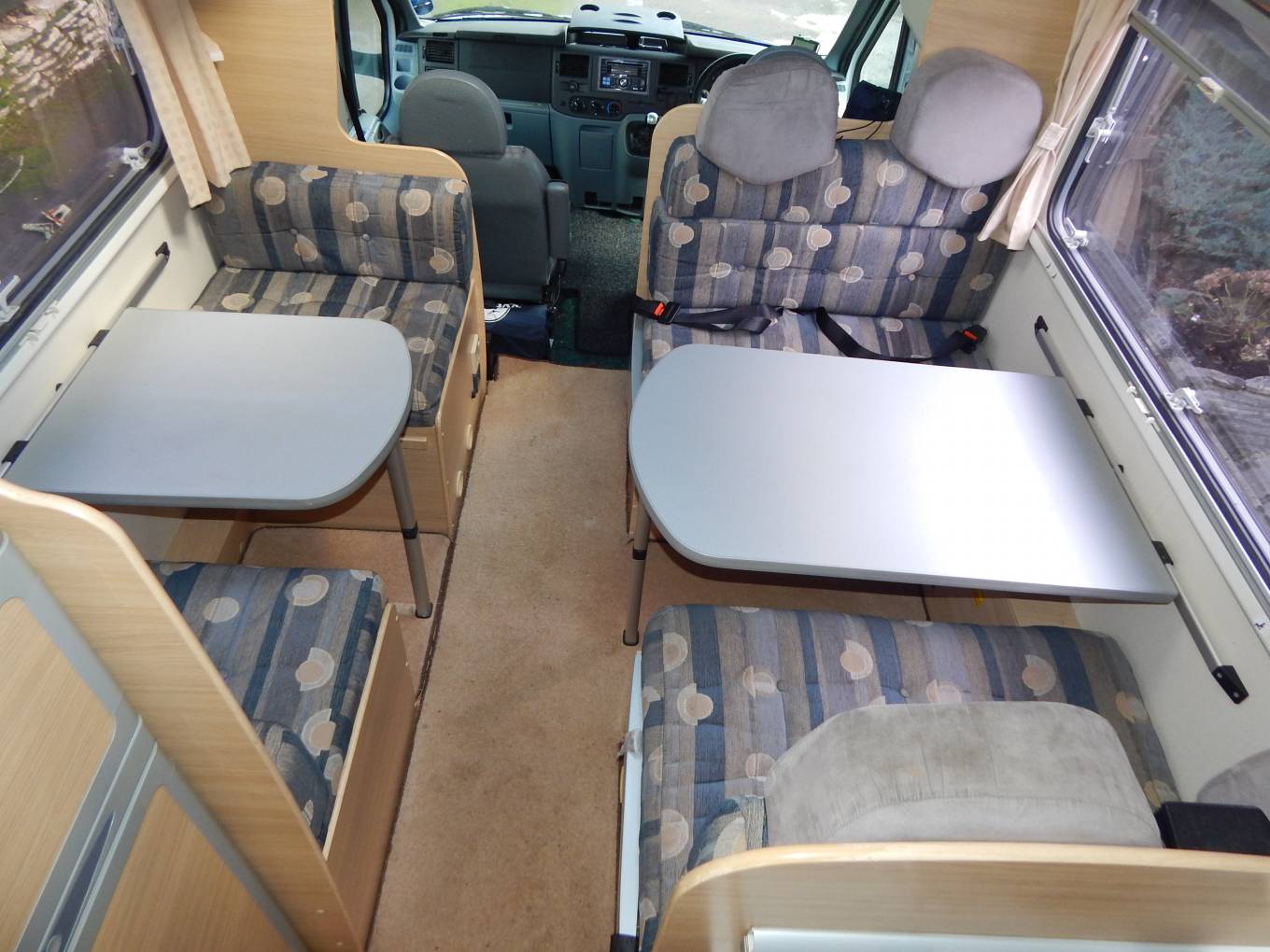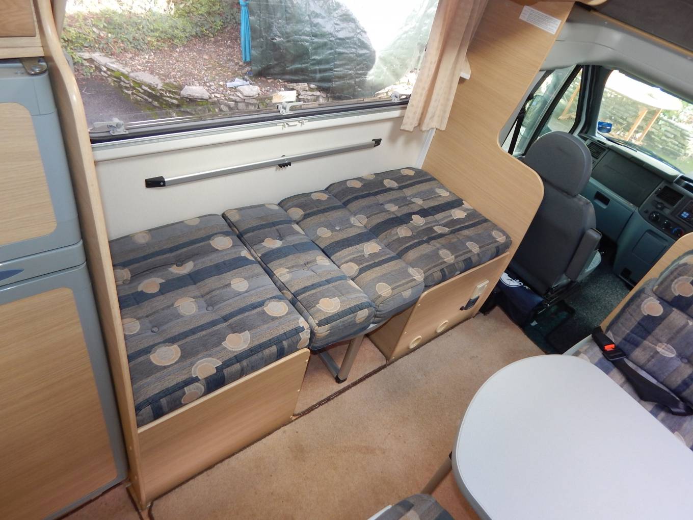 The lounge and dining area can seat 6 people, the offside area has two forward facing and two rearward facing seats, all with seat belts so six travelling seats in total. There is a large dining table that drops down to make up a very large single bed or a compact double bed. The nearside area has a forward and rearward facing seat plus a dining table, again the table drops to make up a single bed. Upper aircraft style lockers provide storage and a sunroof floods the area with natural daylight.