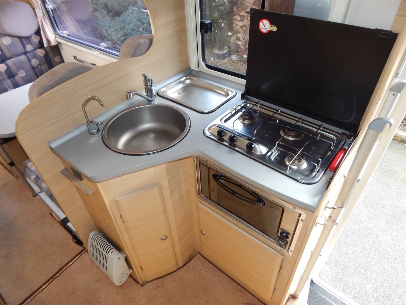Step inside and the kitchen is to your right, with a 3 gas burner hob with a gas oven beneath, stainless steel sink with chrome mixer tap and separate filtered cold water tap, a stainless steel draining area with plug hole, opposite is a tall fridge with separate freezer and there are plenty of cupboards to store away your holiday provisions.