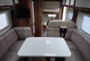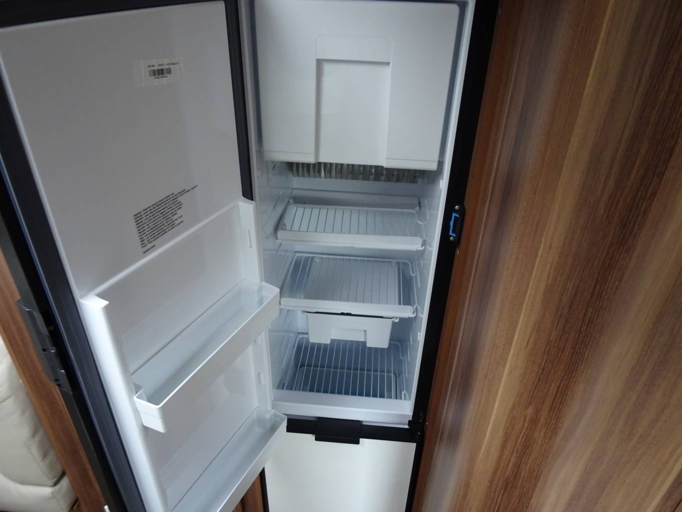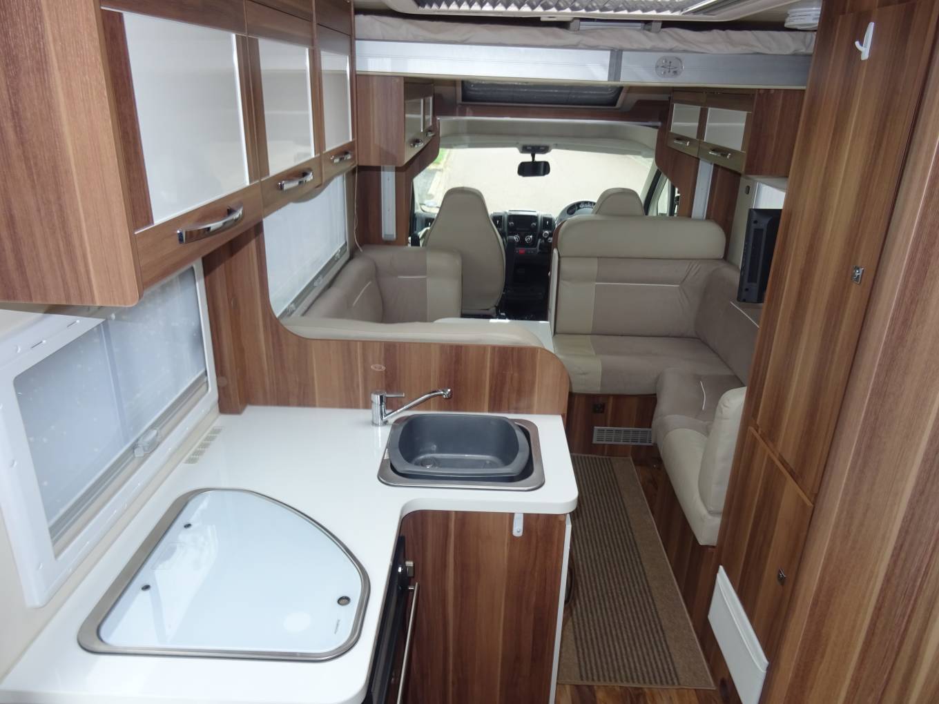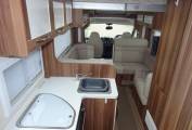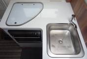 Opposite is the kitchen, with a Thetford Duplex cooker and grill, with a 3 gas burner hob, with cupboards above. At the side of this is an excellent under cupboard with slide out storage. The prep area is more than adequate, enhanced by a bespoke chopping board that neatly covers the sink and removable shelf purposely made, adding more surface space.