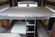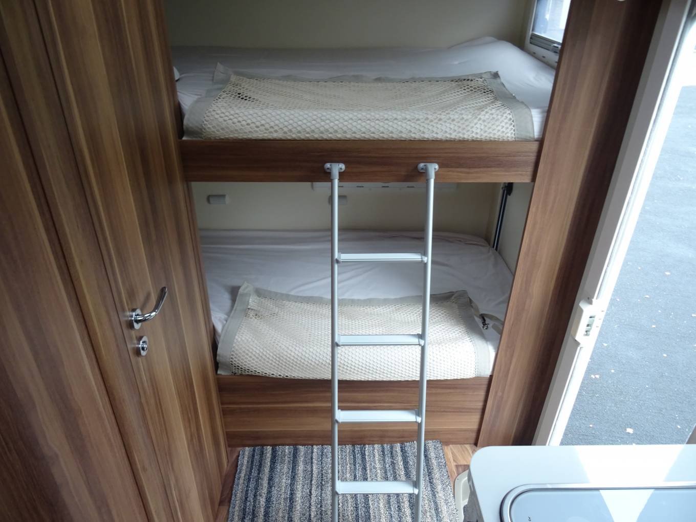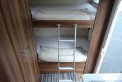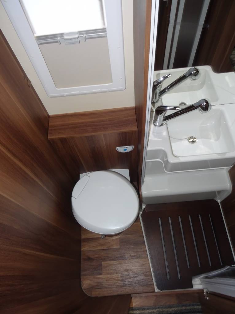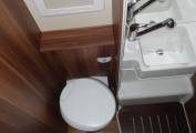 At the rear we have twin single bunks that will sleep 2 adults, the lower bunk can be raised - instantly creating a large rear garage, a fantastic option. Moving up on the drivers side, is the washroom, the toilet being separated from the sink and shower by a bi-fold door. There is a wooden duck board in the shower tray.