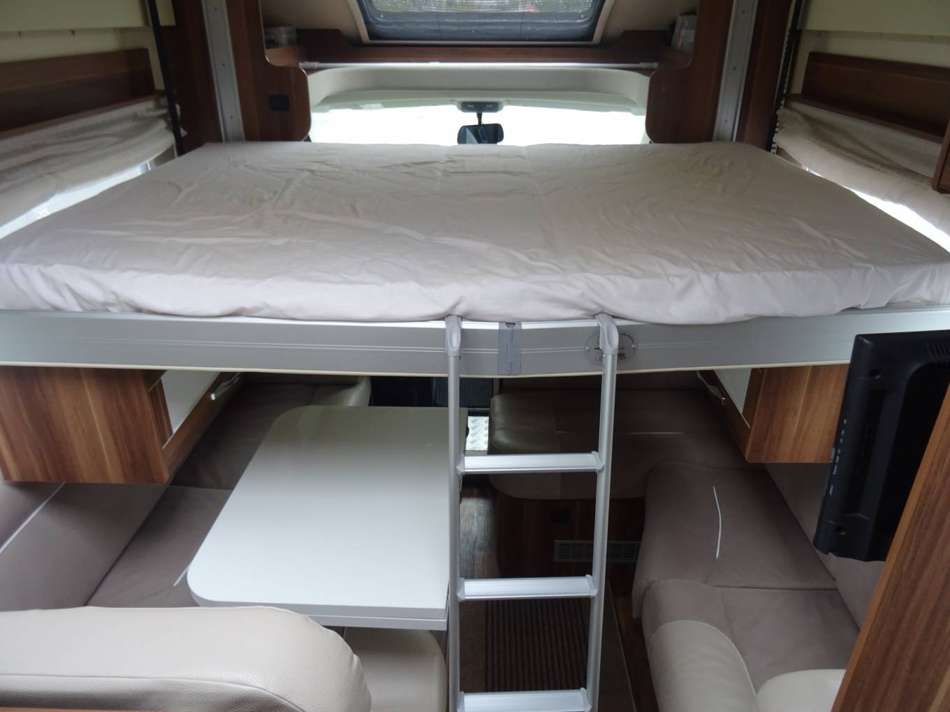 Moving up we are in the well lit lounge, with lots of cupboards, it is double L shaped, with luxurious upholstery, 4 belted seats and is the stand out feature of this great motorhome. This can be converted into a single and double bed. Above is an electric drop down bed.