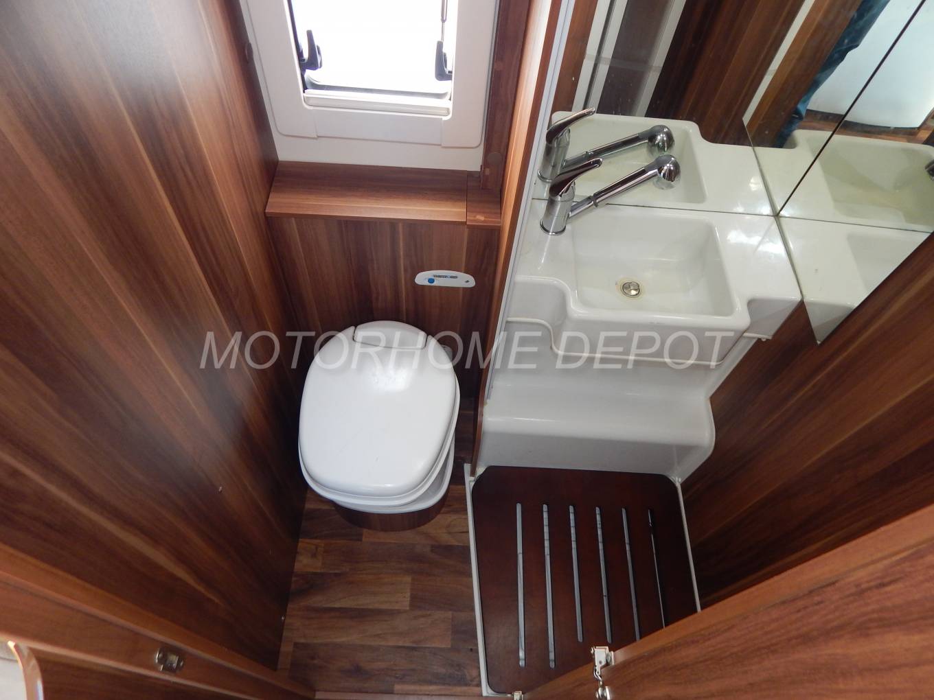 there’s a washbasin with pull out shower handset and mirror above, plus a Thetford