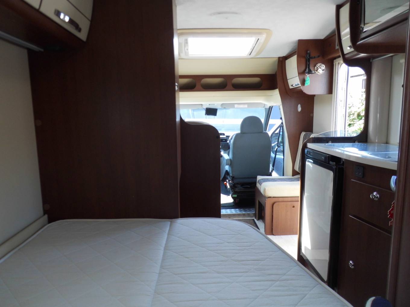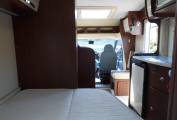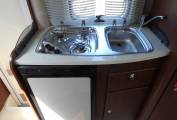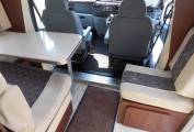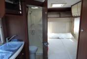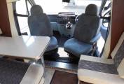 The kitchen comprises of a 3 gas burner hob, a 3 way fridge with freezer compartment, a grill, a stainless steel sink drainer and storage cabinets for all your essentials. Moving forwards you come to the lounge comprising of twin swivel front seats, a half dinette with a forward facing 2 seater sofa with 2 belts, a side facing seat, a sliding table and a large rooflight. There are overhead storage lockers throughout the vehicle.