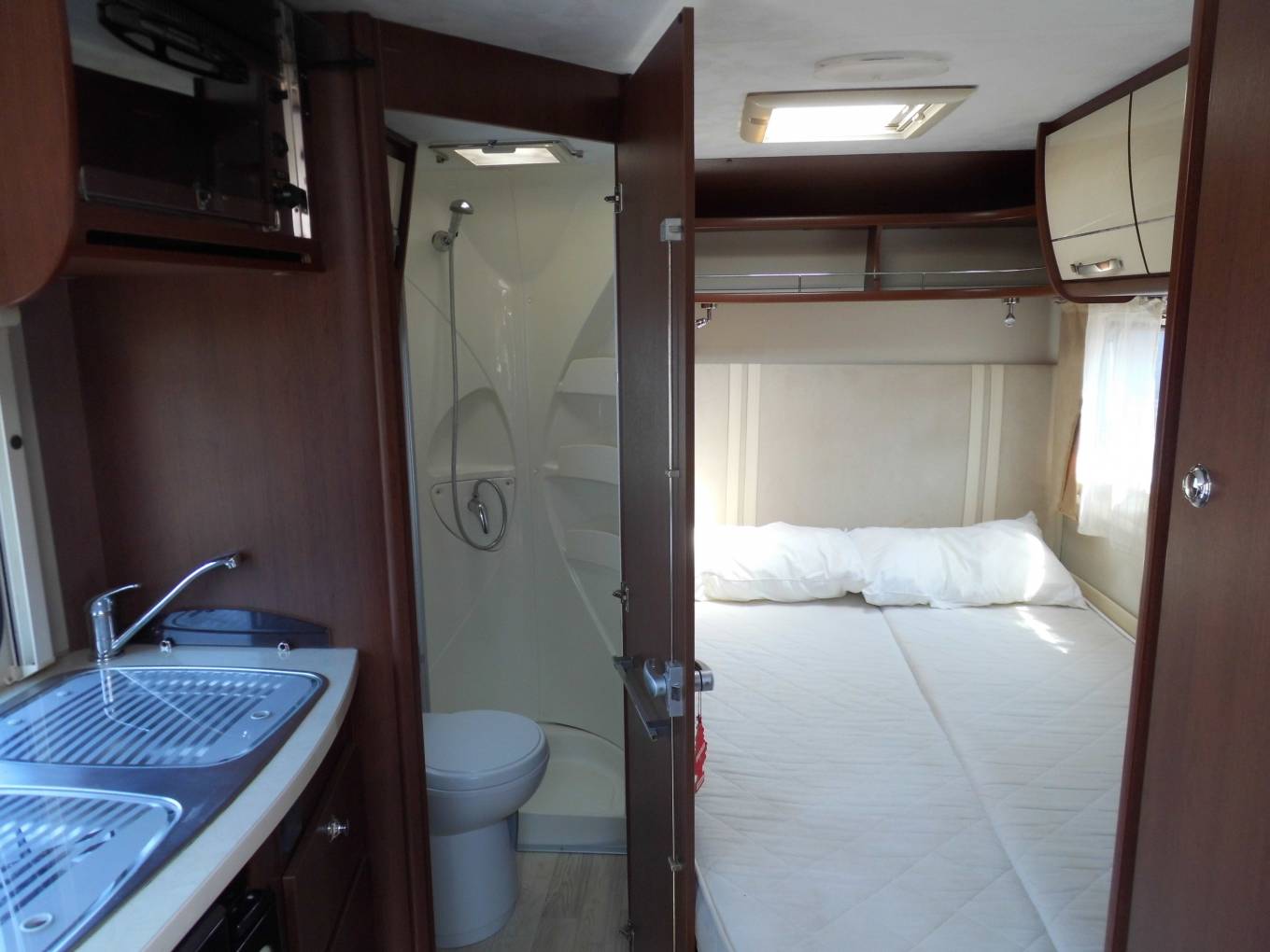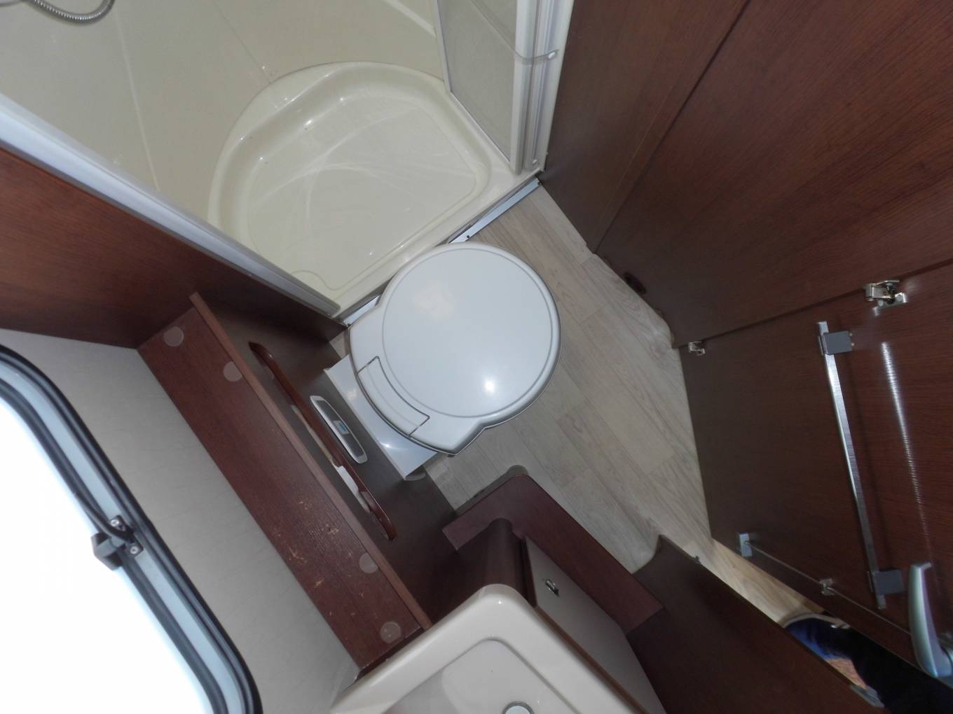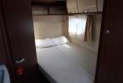 At the rear is a fixed French bed with storage space underneath and additional storage in the overhead lockers as well as a full length wardrobe. To the right of the bedroom is the bathroom which has a separate shower with screen, a cassette toilet, a wash basin with mixer tap, a mirror, a bathroom cabinet, and overhead locker.