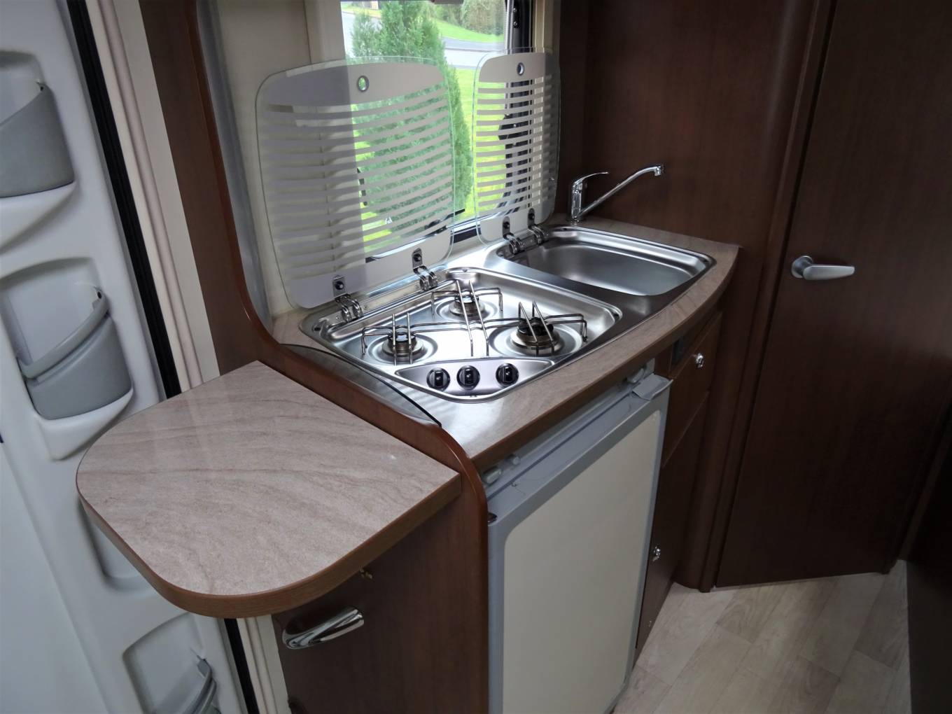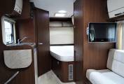 At the rear is a fixed French bed with storage space underneath and additional storage in the overhead lockers as well as a wardrobe. To the right of the bedroom is the immaculate washroom which has a separate shower cubicle, a cassette toilet, a wash basin with mixer tap, a mirror and a bathroom cabinet.