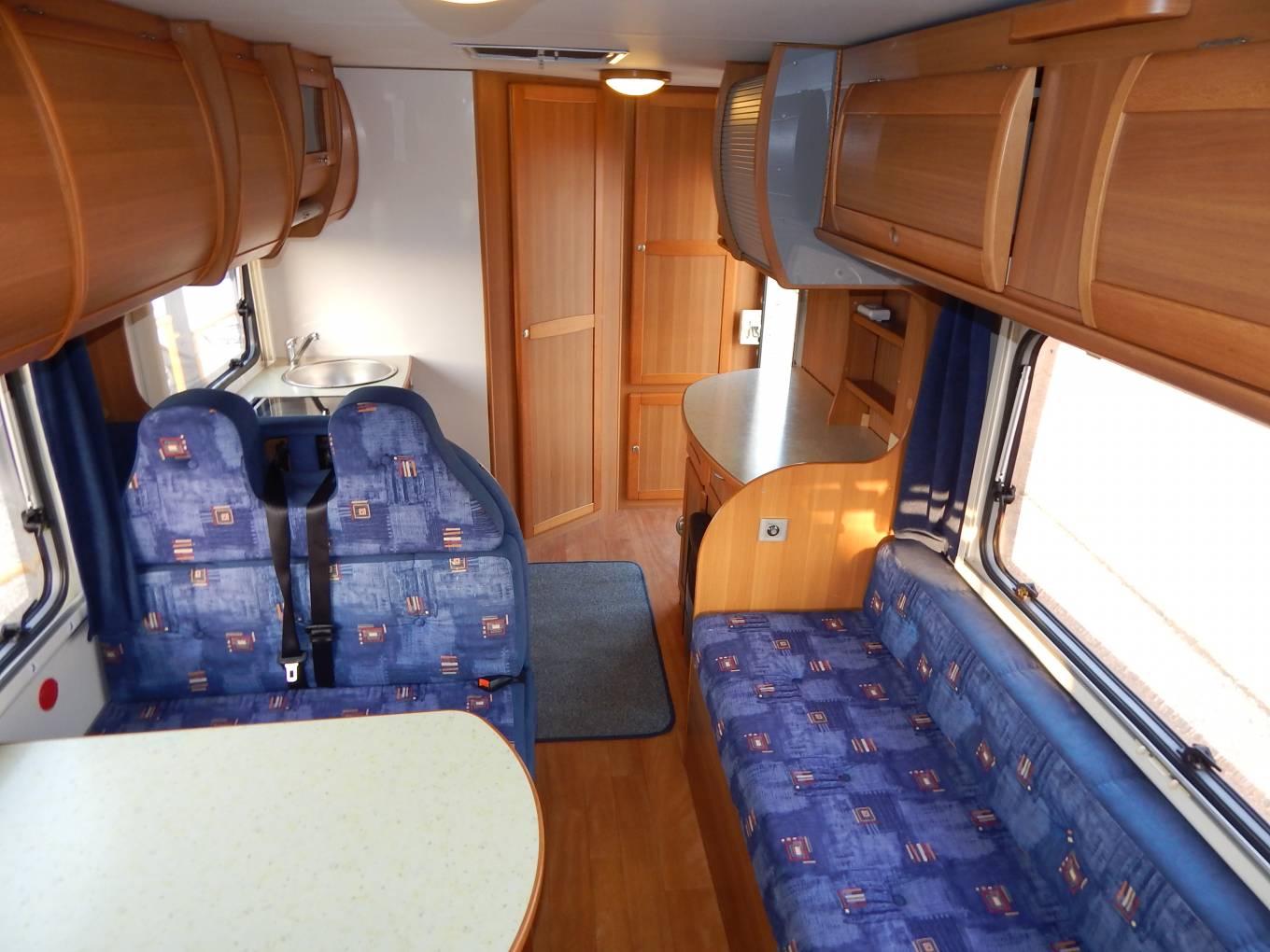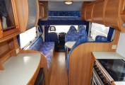 The centre dinette and lounge area has forward and rearward facing seats, all with seatbelts so six travelling seats in total and there is a large dining table attached to the wall, this converts to a large double bed in the evening.