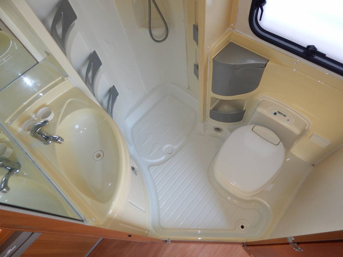 The rear washroom is large and has a separate shower area with shower curtain, washbasin with mixer tap and a Thetford cassette swivelling toilet with electric flush plus storage cabinets.