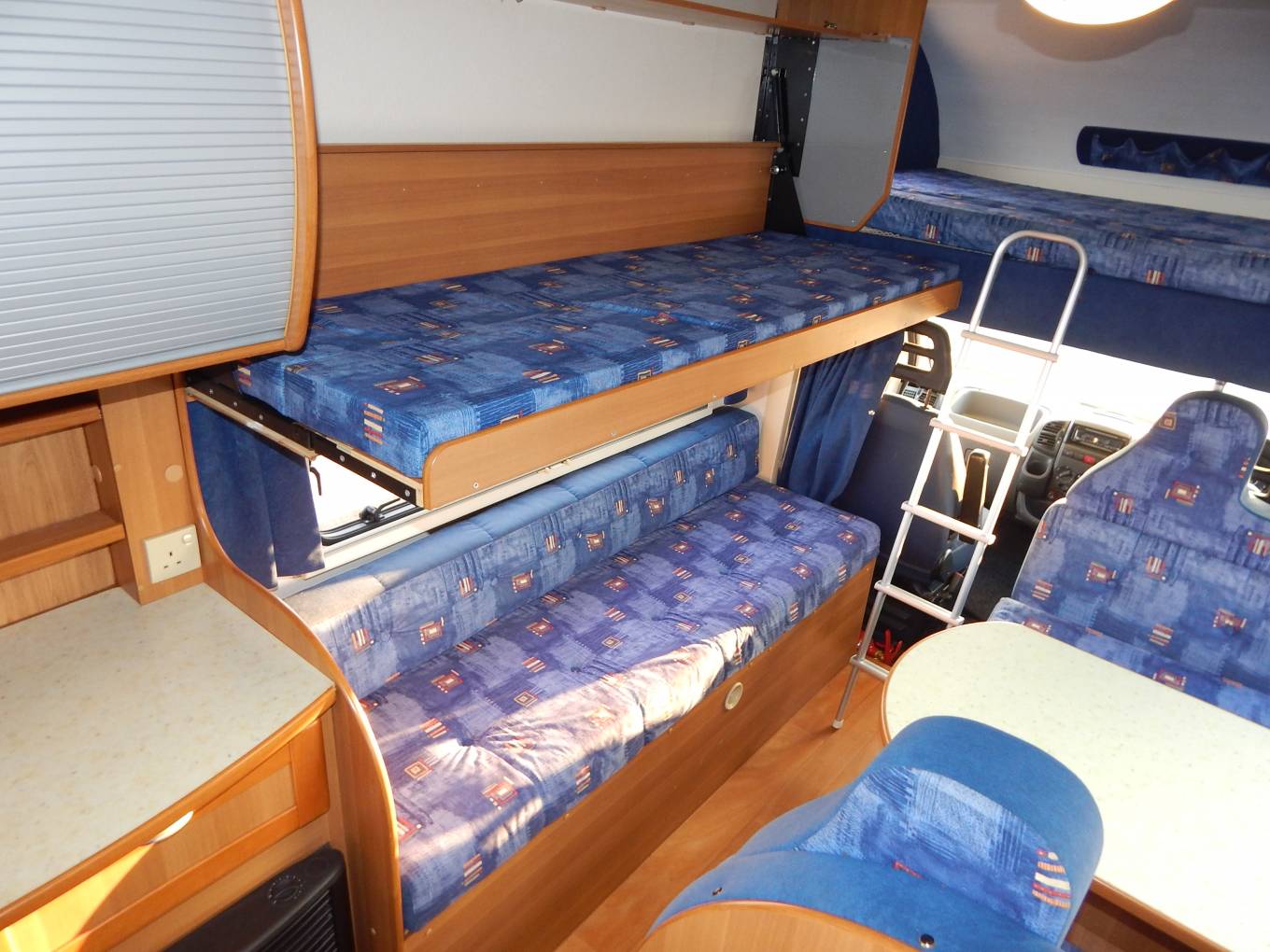 There is a long side sofa that easily converts to a single bed, plus mounted above is the 6th berth in a fold down bunk cleverly disguised as storage cabinets.