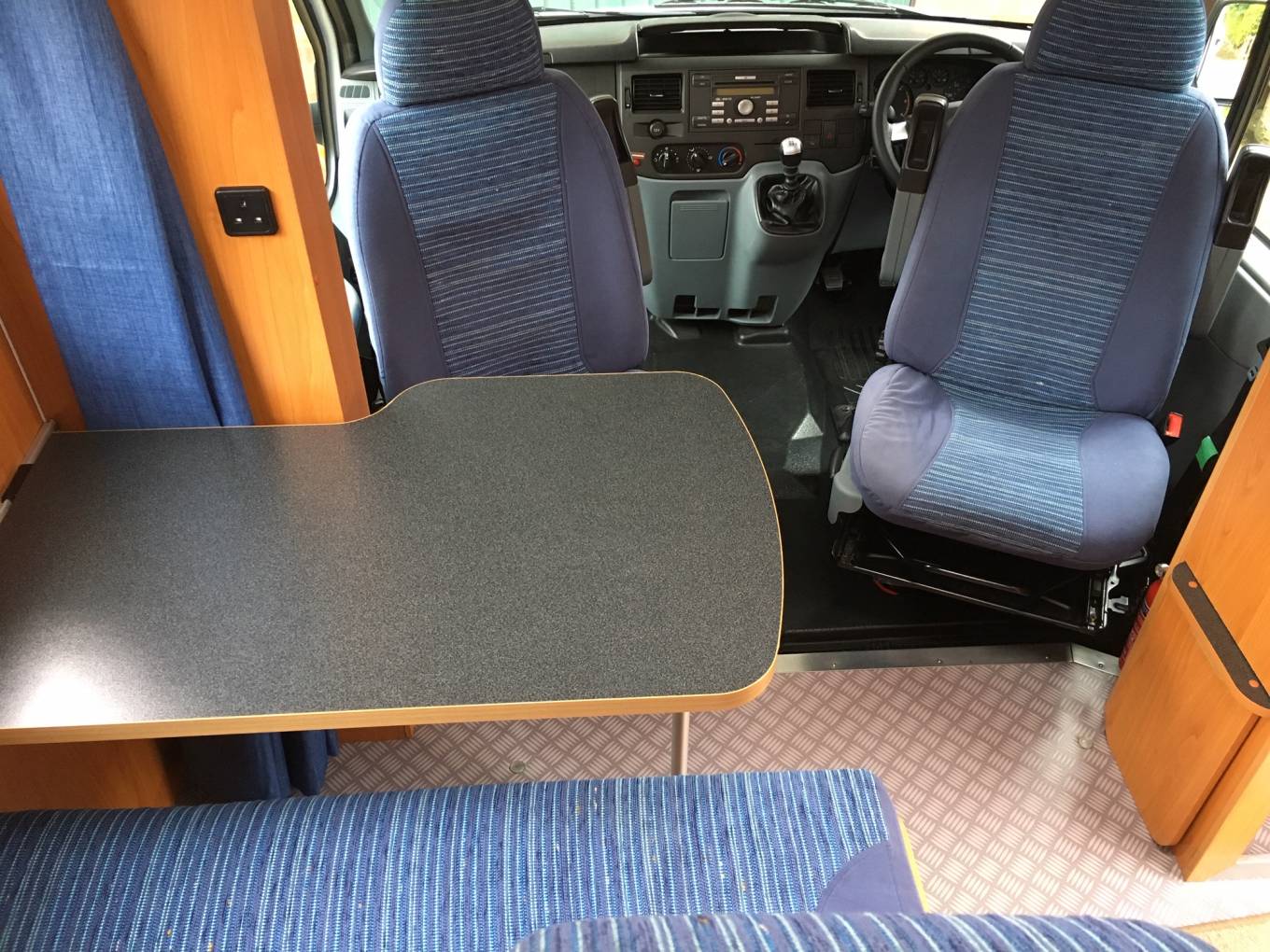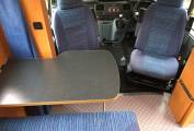 The dinette consists of a forward facing 2 seater sofa with 2 seat belts and a detachable dining table. Both front seats are Captain's chairs so these can be swivelled for the front passengers to join in the fun.