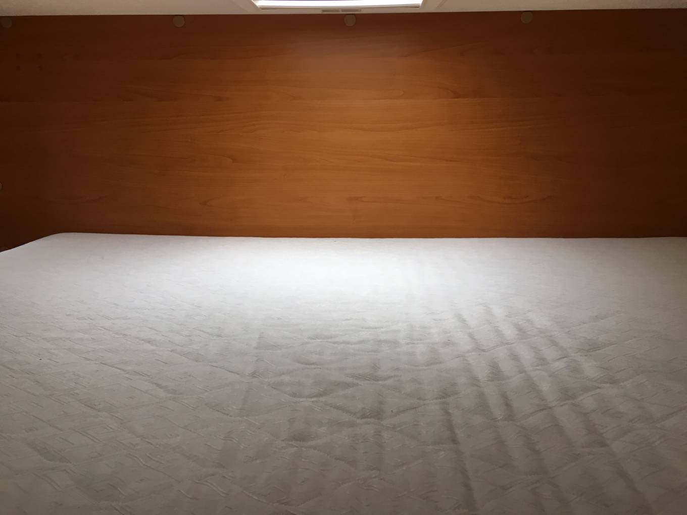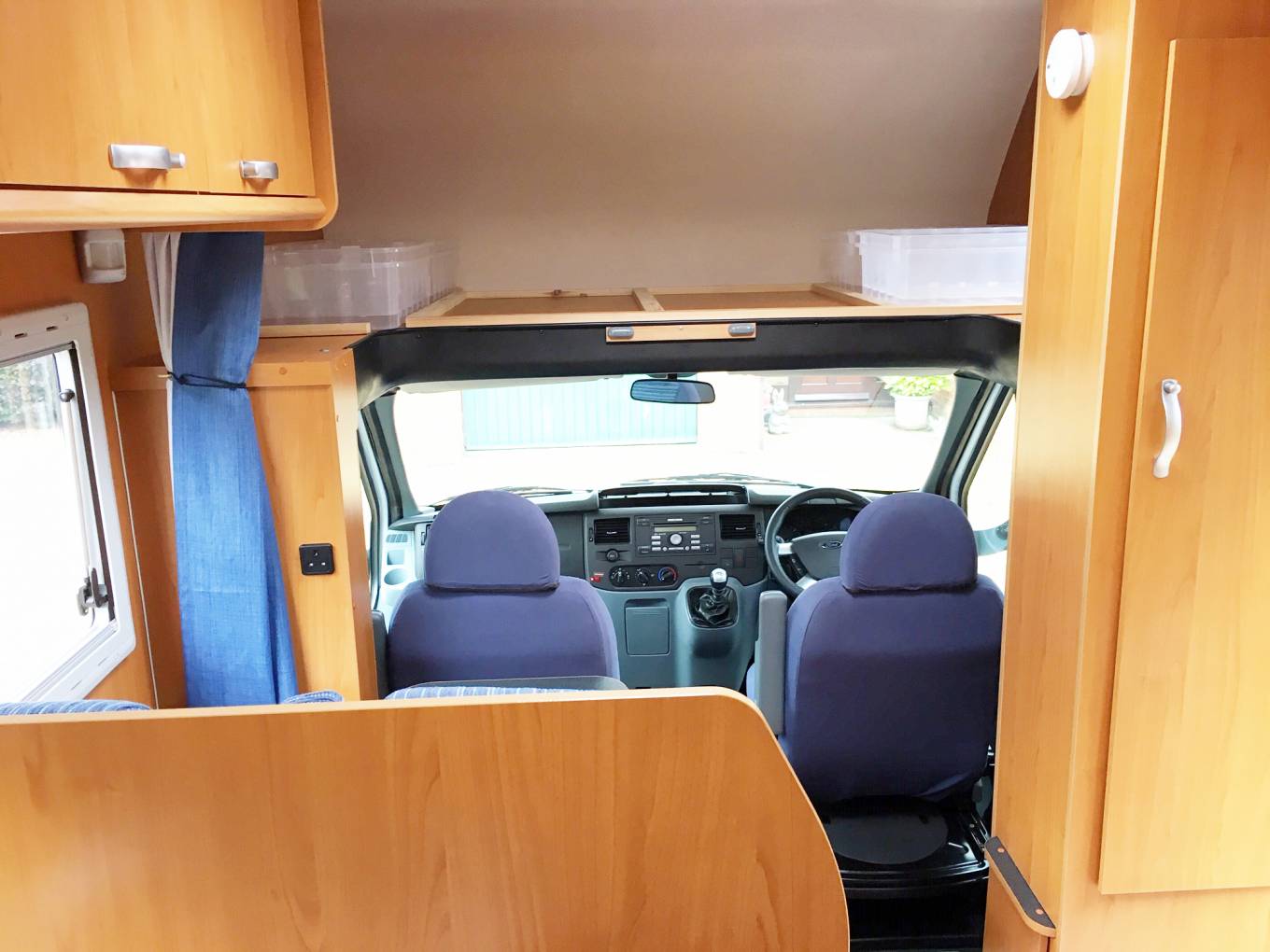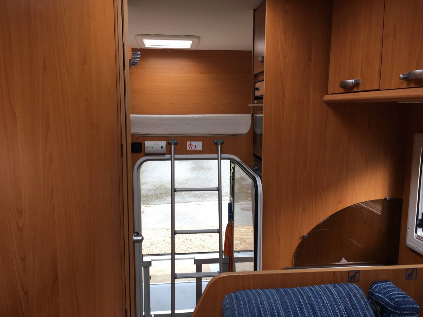 This Roller Team sleeps 4 people. At the rear is a large fixed bed which measures 82 x 54 inches. Above the driver's cab the owner has temporarily removed the double bed but this can easily be put back in to offer the 4 berth configuration. The garage can easily be accessed internally as there is a large access door under the rear bed.