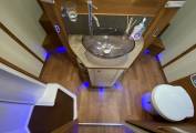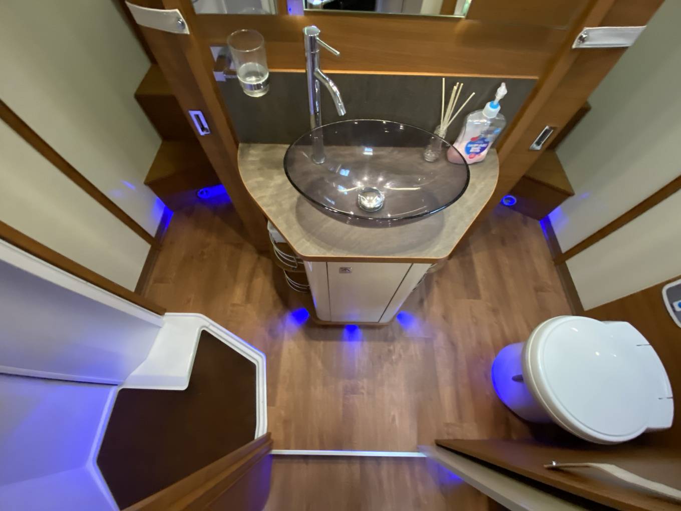The almost unused shower cubicle is on your left, the Thetford flush toilet on the right and the wash handbasin is central with more cupboards and large mirrors.
