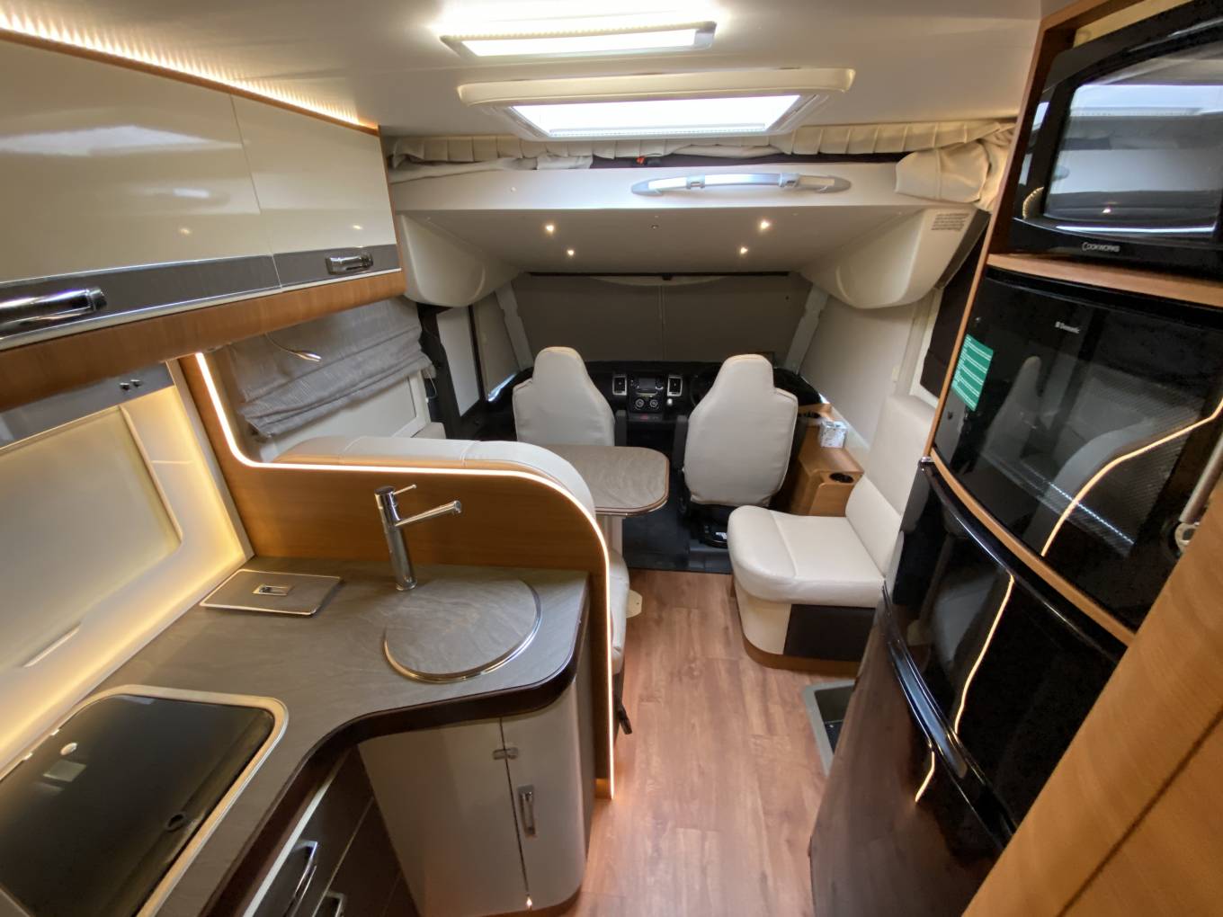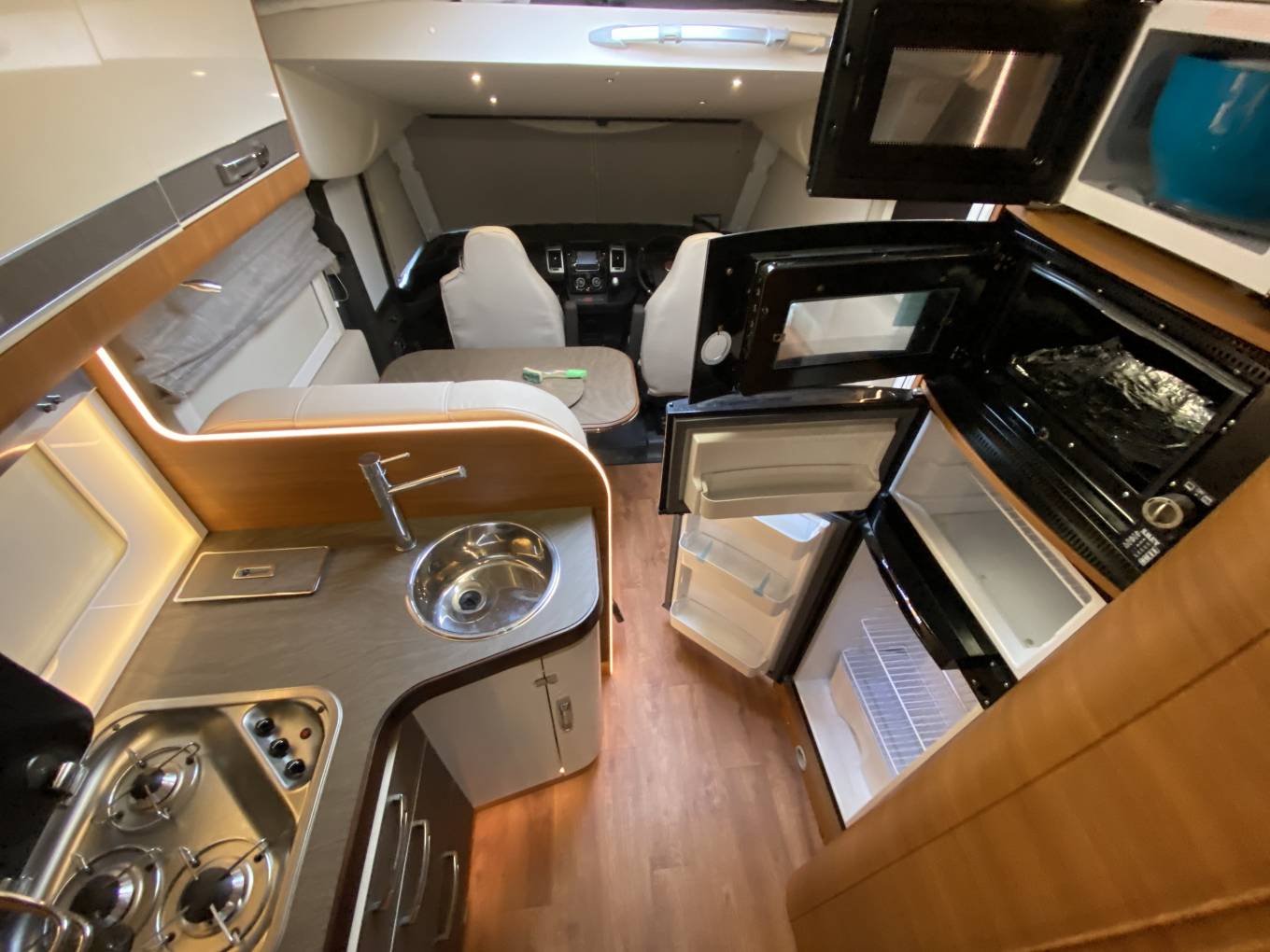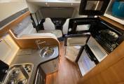 Rear of the lounge across the centre of the motorhome is the well equipped kitchen comprising of a three burner hob, a fridge with a separate freezer, a gas oven above and a microwave oven. The sink and work top area is opposite. There is even a built in waste bin here.