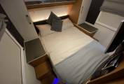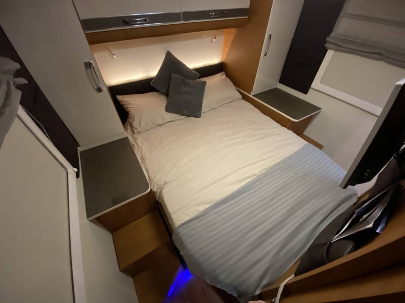 Either side of here leads to the central island bed which can be electrically raised or lowered to suit your requirements, also changing the capacity of the garage below. Sliding doors close off the bathroom.