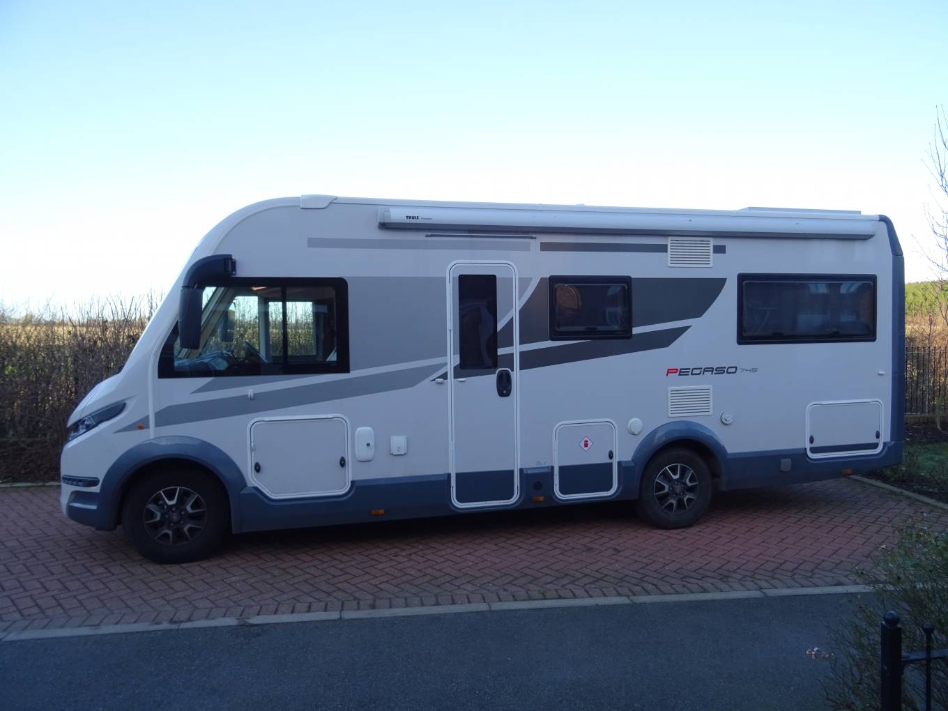 Motorhome Depot North Yorkshire have pleasure in offering this "As new" 2021, Roller Team Pegaso 745 for sale. This beautiful motorhome represents an excellent saving on the new price and benefits from some extremely useful factory fitted extras, including: Rear air suspension (plated to 4000kg), Thule Omnistor wind out canopy and LED light, tow bar, external BBQ point and 240v socket but also the new sought after 9 speed auto gearbox!