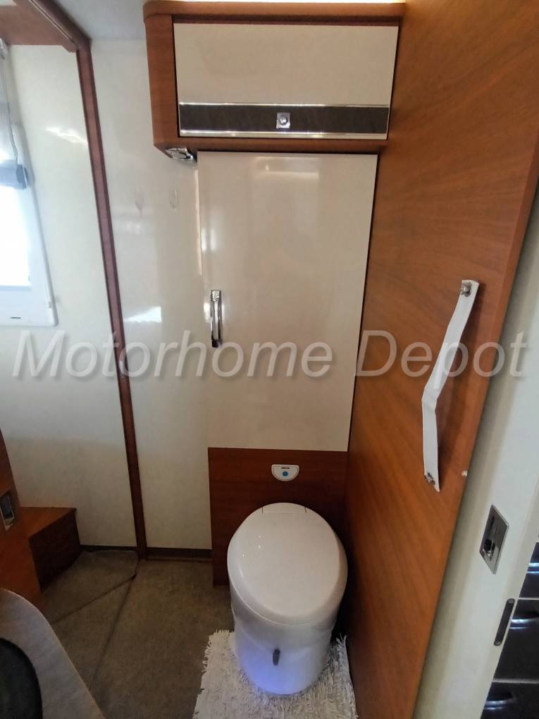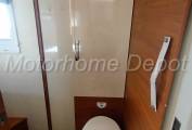 Moving rear is the bathroom area that covers the whole centre of the motorhome, it can be closed of front and rear to be completely private while dressing. In the centre is a modern glass bowl pedestal sink with cupboard below and a large mirror above. To the right is the Thetford cassette style electric fresh water flush toilet. On the opposite side is the shower cubicle that can be closed off with Perspex doors.
