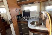 Moving rear is the L shaped kitchen which consists of: bowl shaped sink with chrome mixer tap, chopping board cover; 3 gas burner hob; peel bin; 12v extractor fan above. There is plenty of cupboard and drawer space for all your holiday provisions. On the opposite side is a large Dometic absorber style fridge with separate freezer compartment that can automatically be powered by 240v,12v or gas. Above this is a good sized Oven & grill, there is also space above the oven that will fit a Microwave oven.