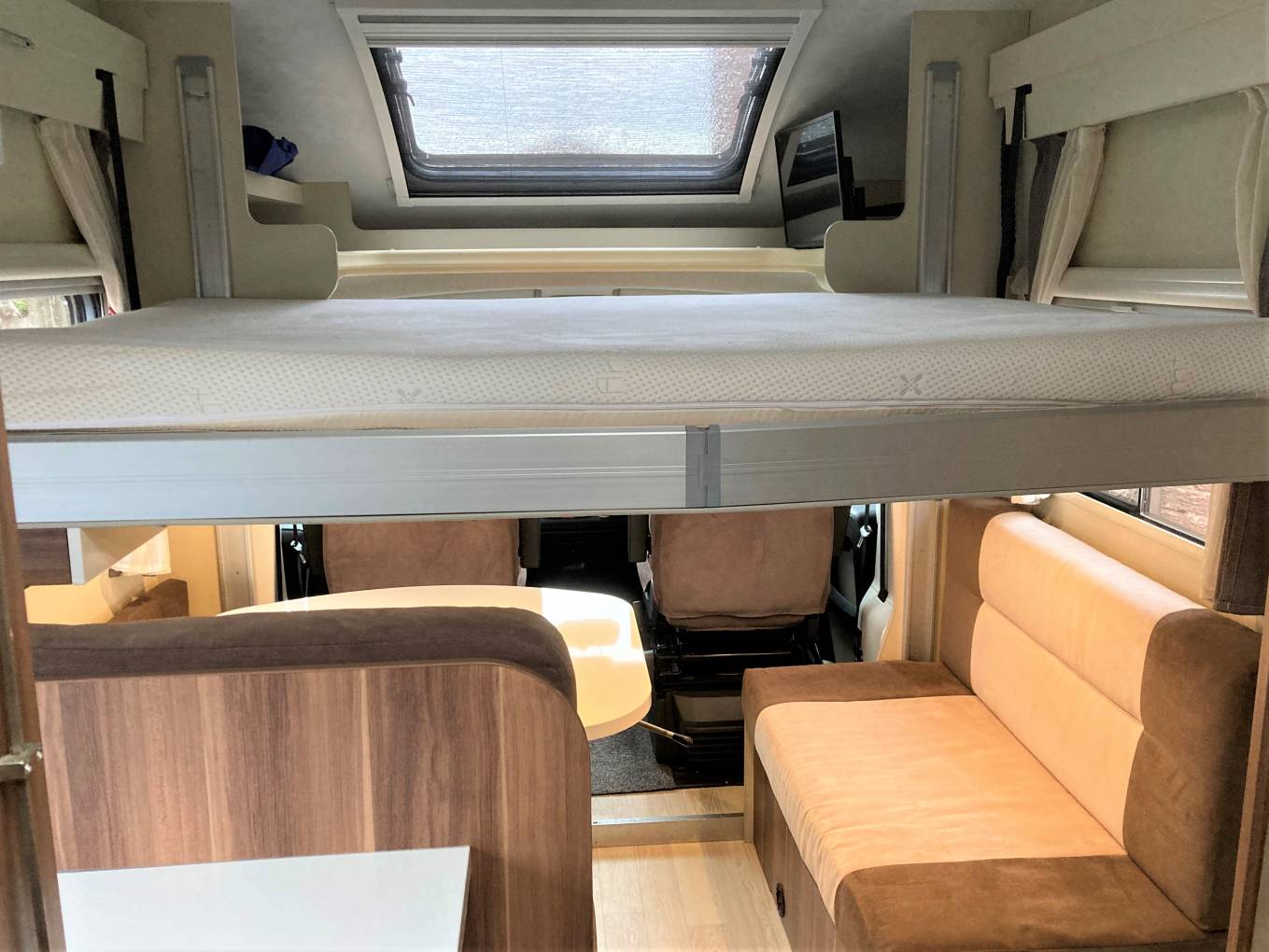 motorised drop-down bed that is stored in the roof of the living area. This