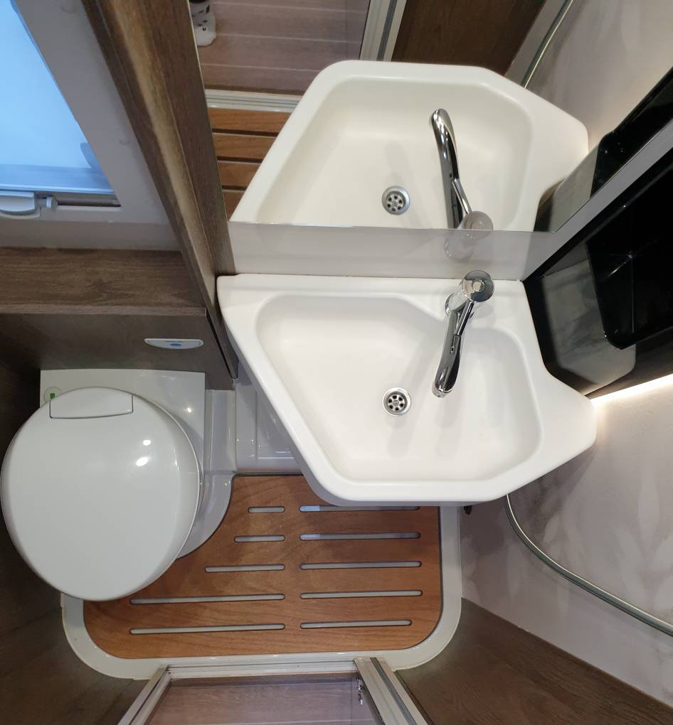 pivoting wall that divides the shower and toilet areas. The 2 drop down beds, one above dinette and
