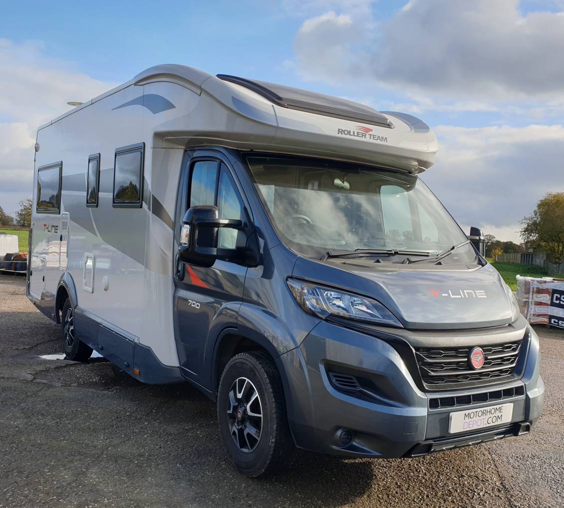 Motorhome Depot Chester and Wirral are pleased to offer for sale this luxury lo-line, 4 berth, 4 belted 2022 Roller Team T Line 700 on the popular Fiat Ducato chassis. The vehicle is driven by a 2.2 litre, 140bhp, Euro 6 turbo diesel engine on a manual gearbox and has covered 19,244 miles. The motorhome weighs in at a licence friendly 3500kgs.