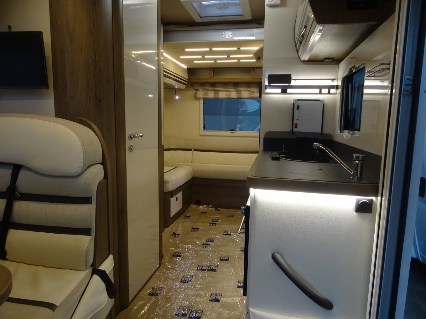 The motorhome is in lovely condition with some very useful extras fitted over and above standard - Front and rear parking sensors, AVTEX TV, Gas-flow system (cheaper to fill up) and a Motorhome WI-FI system, to name a few. Internally the habitation area has a very light and modern feel to it, with its cream textile & leather upholstery (scotch guarded for easy cleaning), light coloured cupboard doors and a very spacious rear lounge - it is a lovely place to relax and watch the world go by, you will also keep toasty warm with the Truma heating system and insulated blinds! At night time the electric double beds are quickly lowered creating easy access and enabling you to sleep soundly in comfort. The kitchen area also benefits from all you need for that long trip away, a 3 burner gas hob, oven/grill and a large fridge to hold plenty of food and drink, as there are 2 leisure batteries and a solar panel, this brings off grid camping on to your bucket list of things to do!