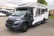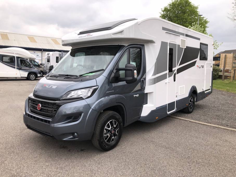 The T-Line 740 is a 4 berth luxury lo line motorhome featuring a fixed island bed at the rear, front electric elevating bed, central sink and separate shower and toilet.