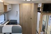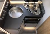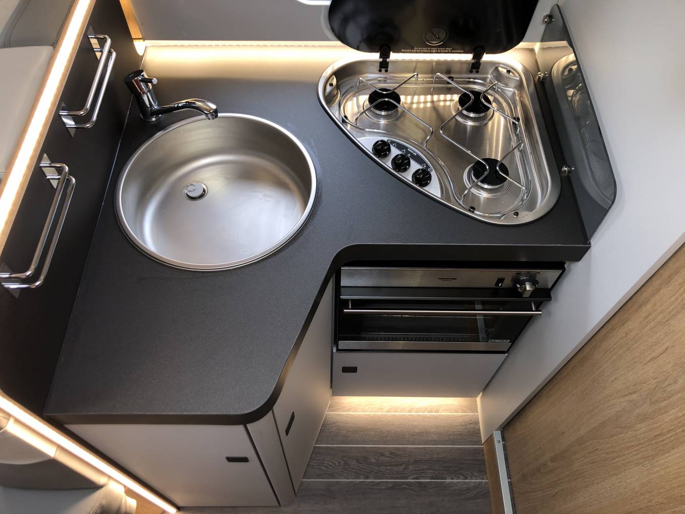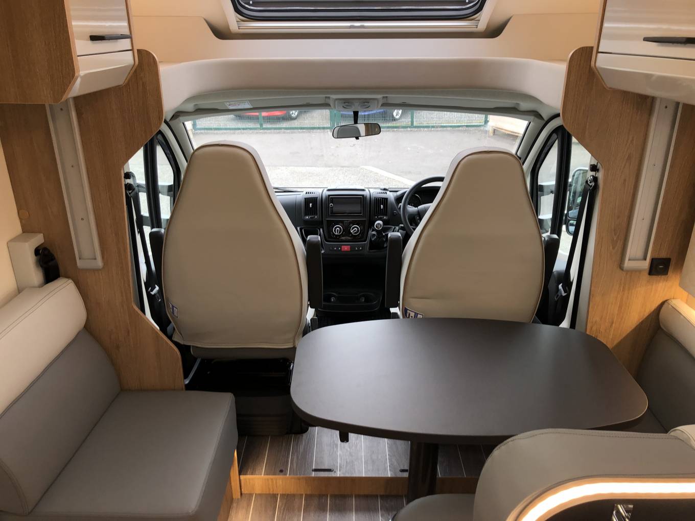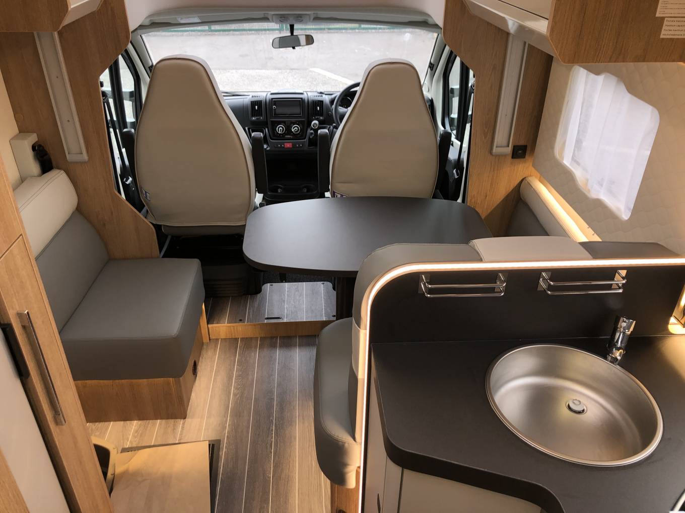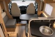 An L-shaped dinette with luxury upholstery provides comfortable seating during meal times and the evening, with a mounted table for meals and drinks. The modern kitchen area includes oven/grill/hob and fridge freezer. This motorhome comes with reverse parking sensors and a tv aerial fitted.