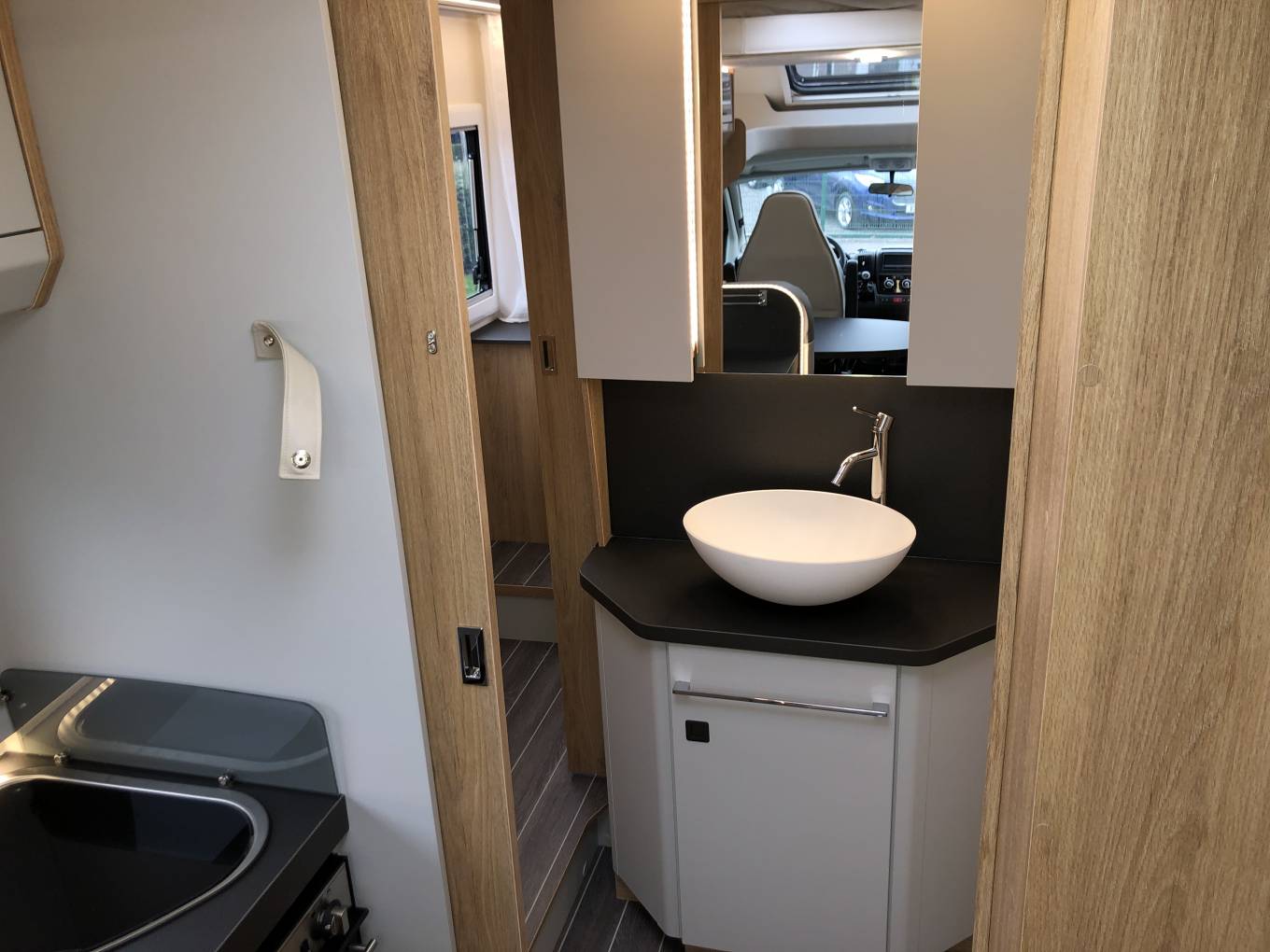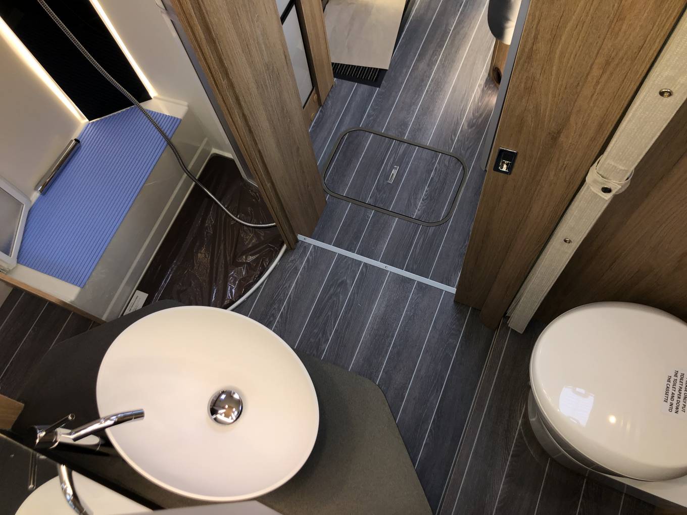 Sliding doors off the bedroom and washroom keep day and night separate and offer more privacy. The split central washroom offer the wow factor and boutique hotel feel to this motorhome.