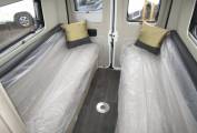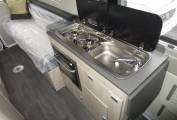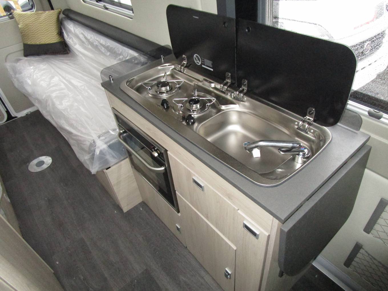 Firstly, we start at the spacious rear lounge. This is a brilliant place to relax and take in the surrounding views. When the night draws in the rear lounge converts into a comfortable transverse double bed. As we move forward through this light and airy Camper Van we arrive at the kitchen. This well equipped kitchen features a gas oven, 2 ring gas burner, 3 way fridge and wash basin. Opposite is the washroom which includes a toilet, shower and hand washbasin.