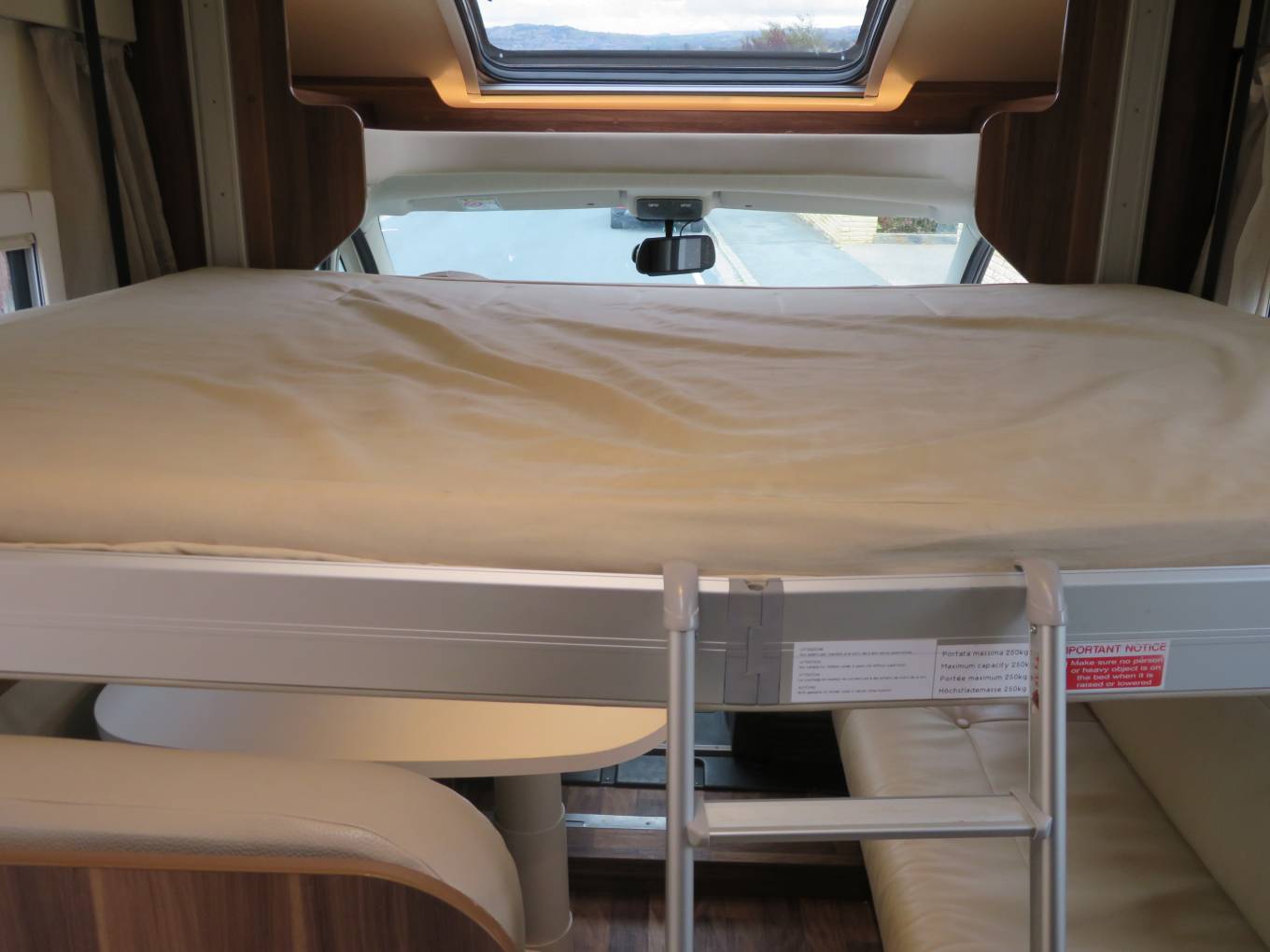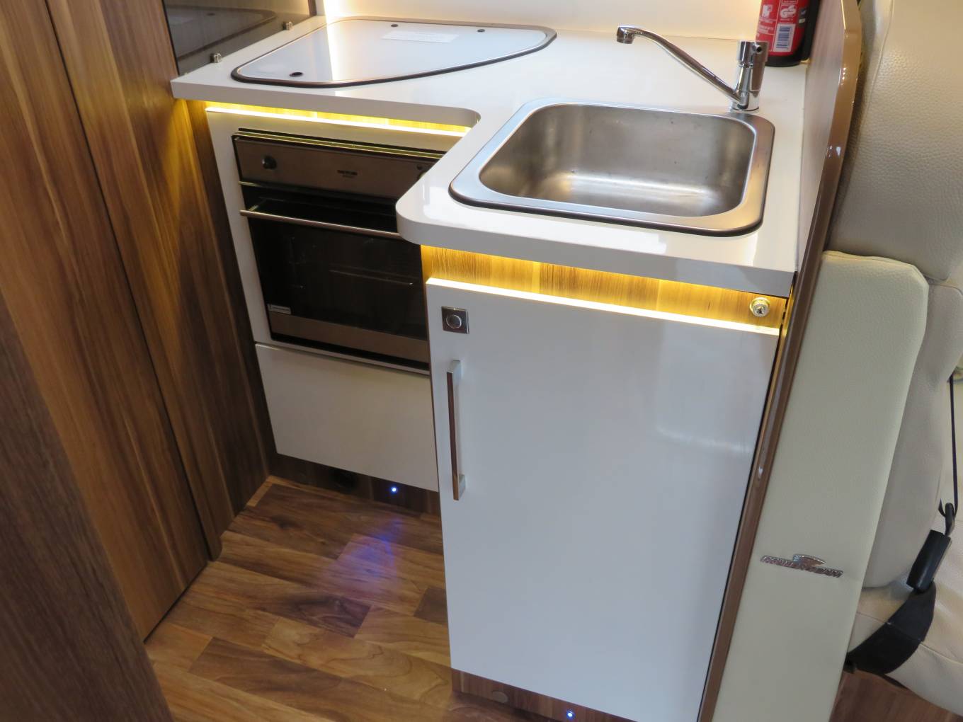 This 256 TL is only 6 meters in length and comes with a great layout, At the rear you have a great washroom with WC.Wash basin and separate shower as well as access to the rear garage compartment, Moving forward to a well laid out kitchen area witch includes Hob,Oven,Grill, Tall Fridge and plenty of storage with very impressive lighting. At the front you have a very comfortable dinning area that will comfortable seat 4 with its adjustable table and leather effect trim which not only looks great but is also easy to keep clean,this area also converts to a double bed and above this you have the electric drop down double bed and finally you have the two swivel seats at the front which also adds to the comfort of this great dinning area.