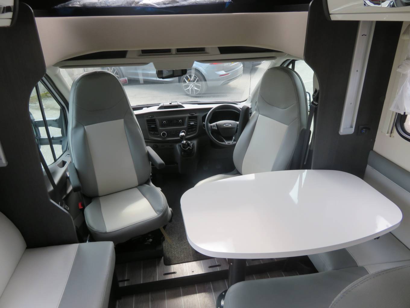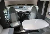 The front drivers and passenger seats both swivel to create a large seating area around a table.