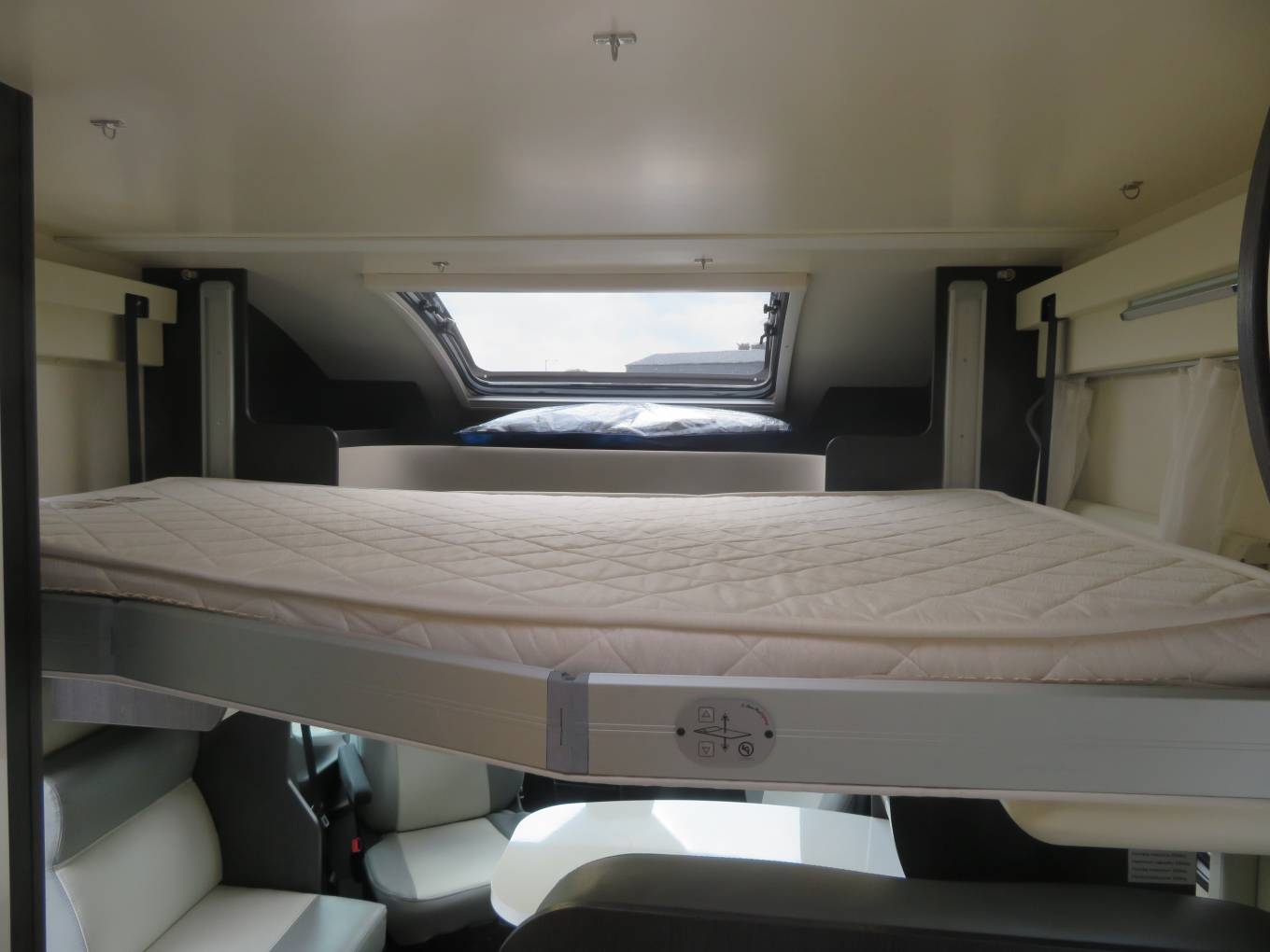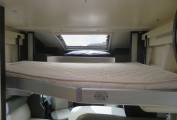 The layout consists of 2 x double beds with a fixed double at the rear above a huge garage storage area and another double bed which is stored in the ceiling of the living area and is lowered with an electric mechanism.