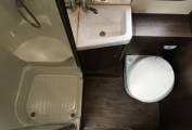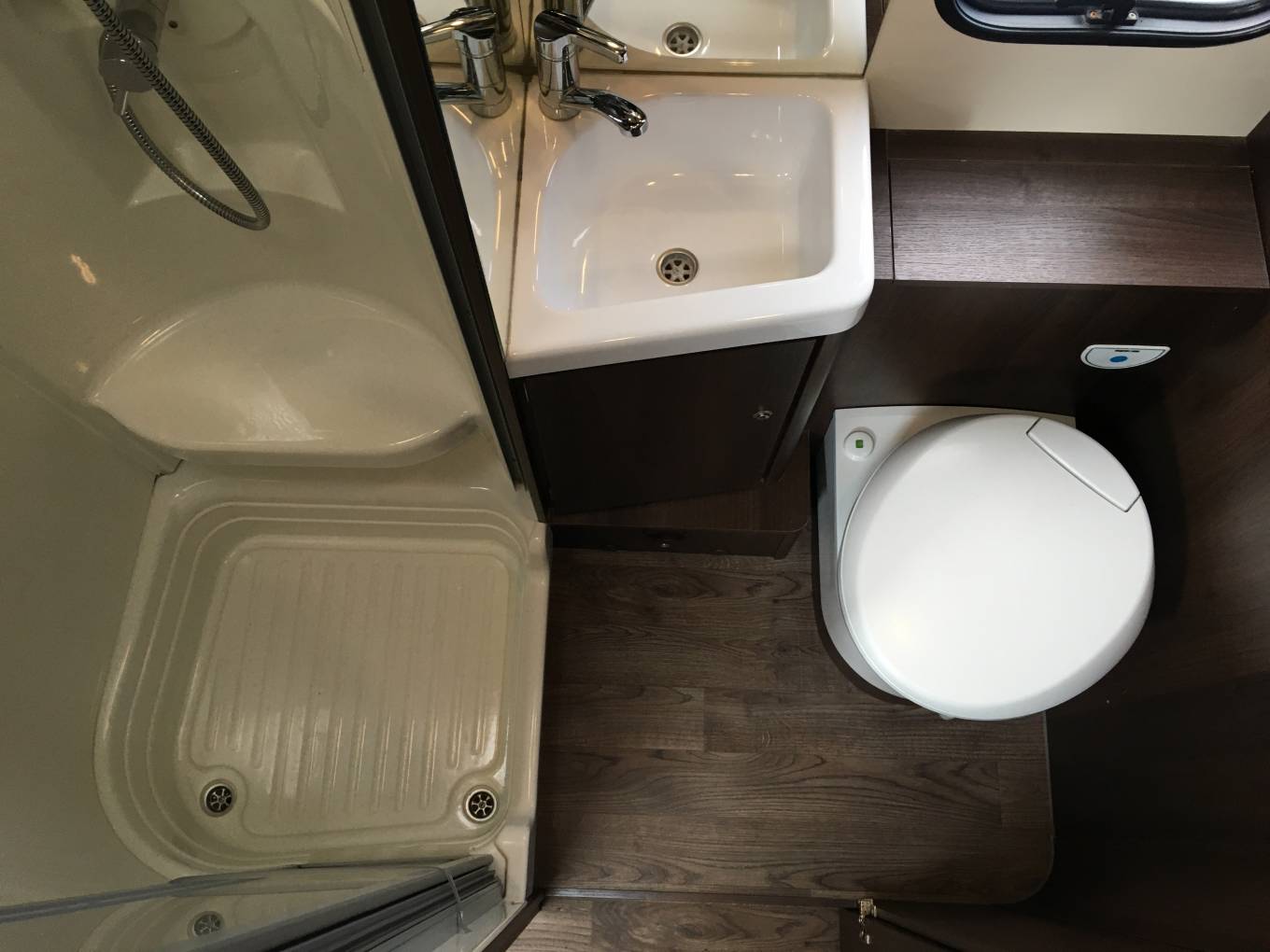 washroom with a swivel Thetford cassette toilet, vanity washbasin, mirror, walk-in