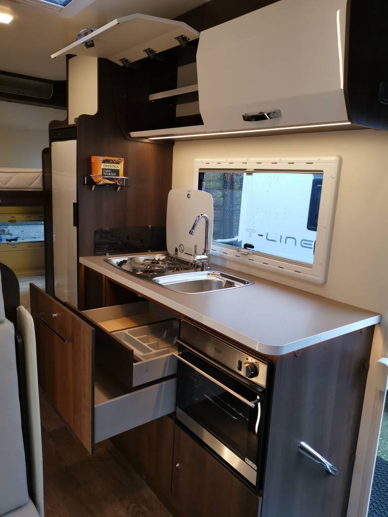motorhome is light and airy and offers sleeping for 6 with an ample sized over