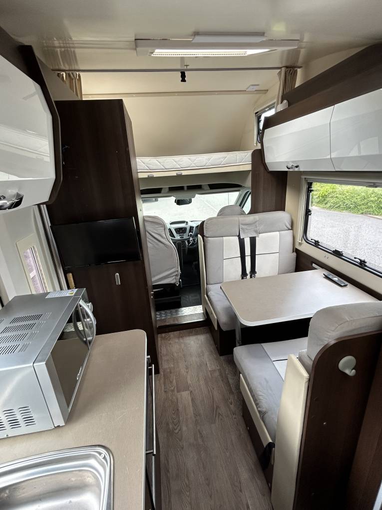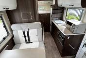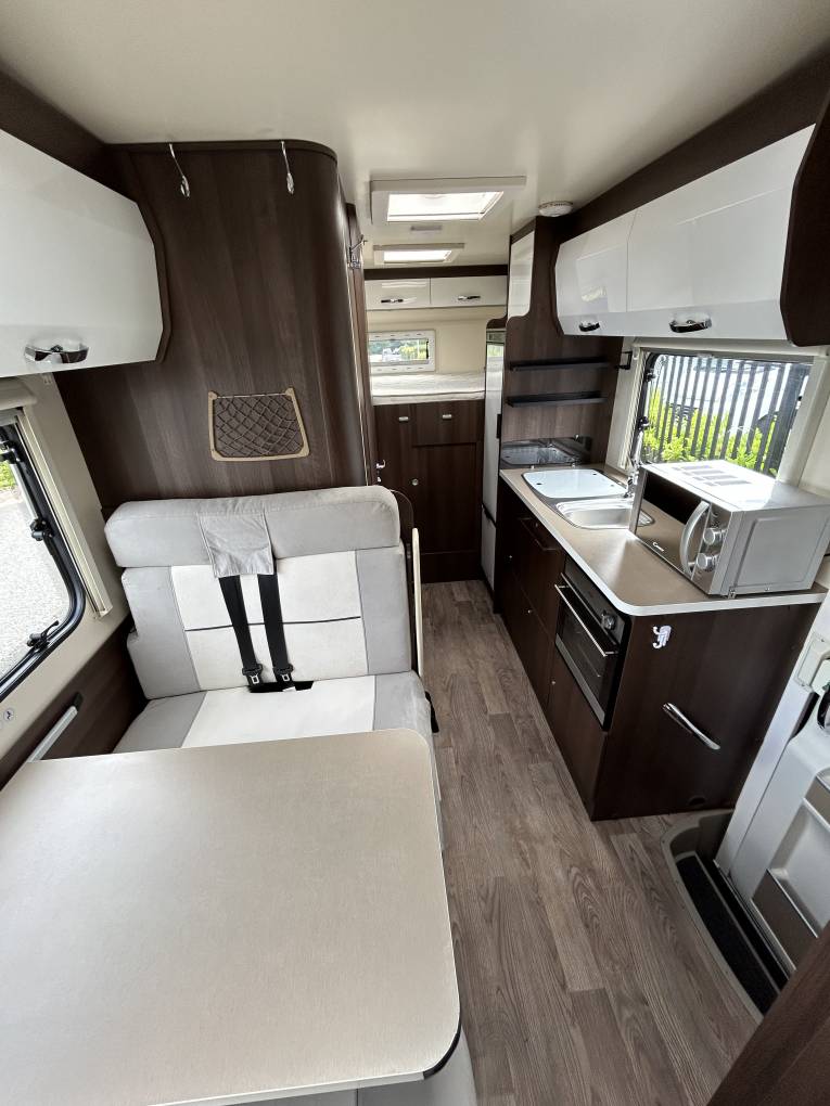 The kitchen area is behind the Centre Dinette Area and across from the habitation door which allows extra ventilation when cooking a hearty meal for any occasion and comes with 3 Gas Hobs, Hot and Cold Mixer Tap, Oven and Grill Combi and a Large Modern Fridge with freezer space and a cool box! The centre dinette area allows you to travel an extra 4 people with 2 front and 2 rear facing three point travelling belts.