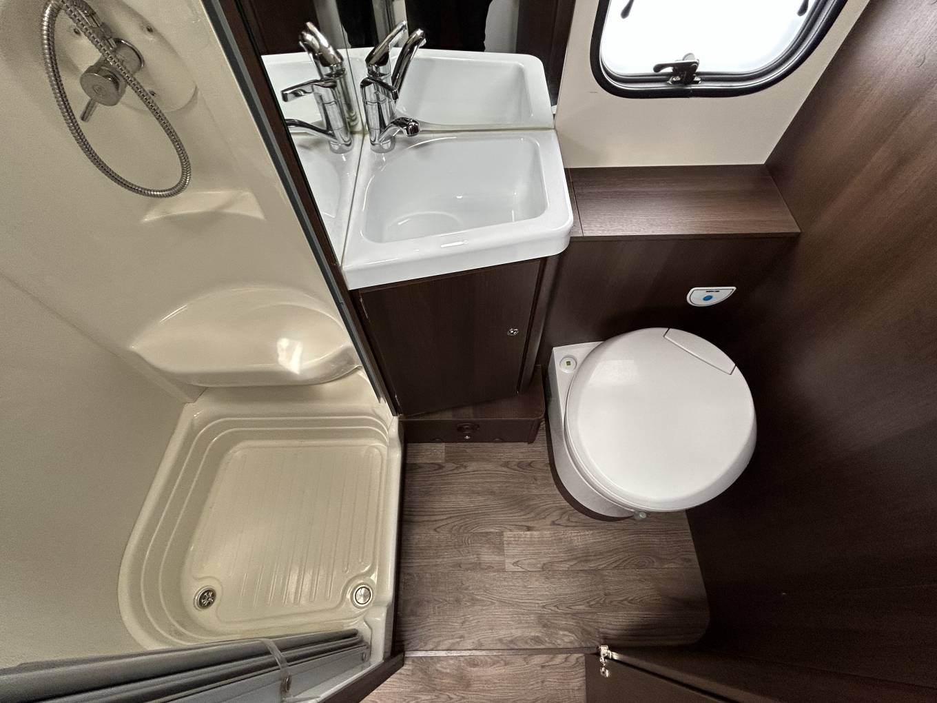 At the rear you have the large double fixed bed that sits on top of the large garage, you then have the washroom in front of the bed that boasts everything you need to refresh and recharge and comes with the desired separate shower cubicle as well as the Thetford toilet, wash basin, storage space and large vanity mirror.