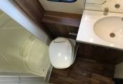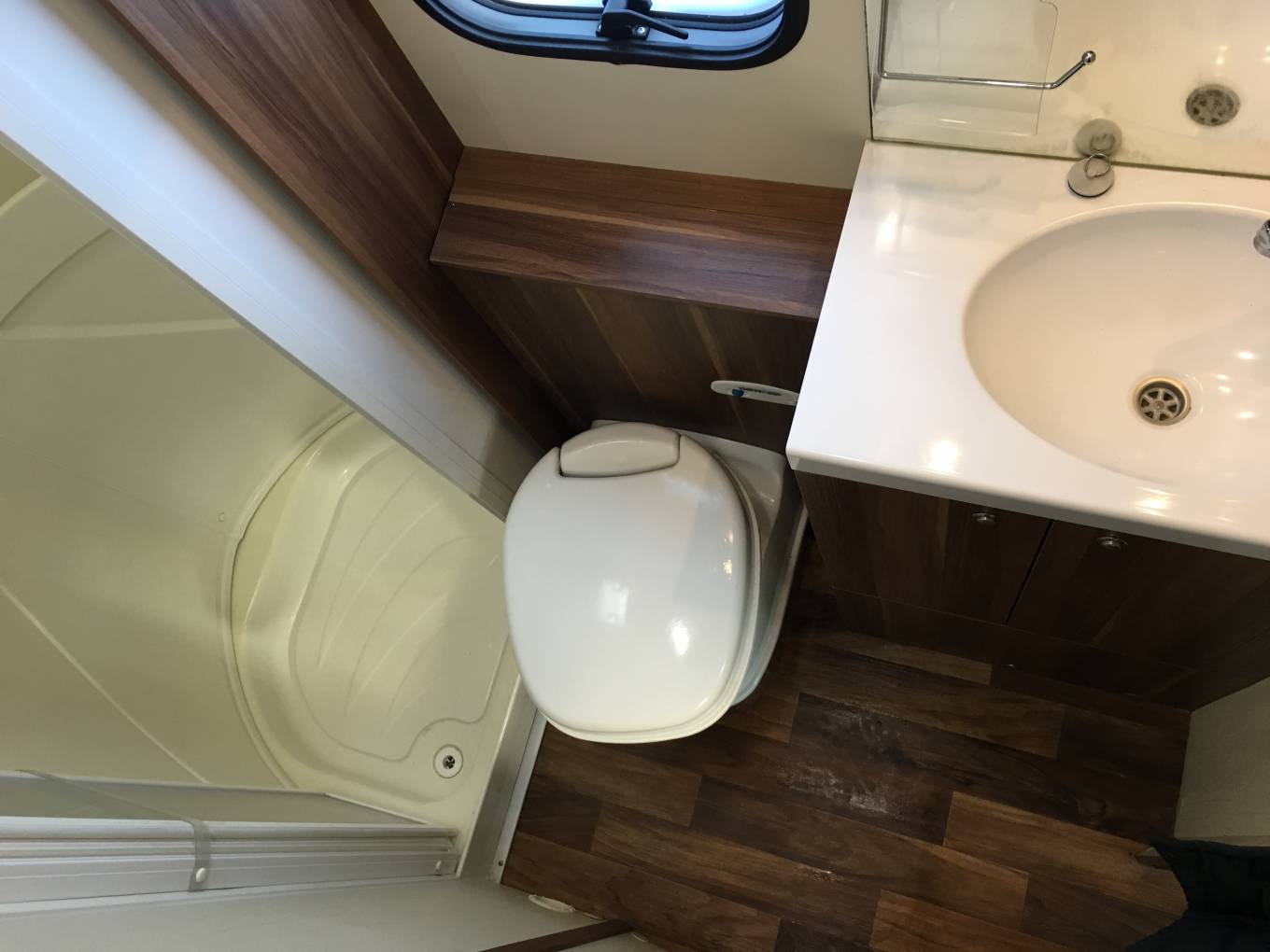 chrome mixer tap, a Thetford cassette swivelling toilet and a medicine cabinet,