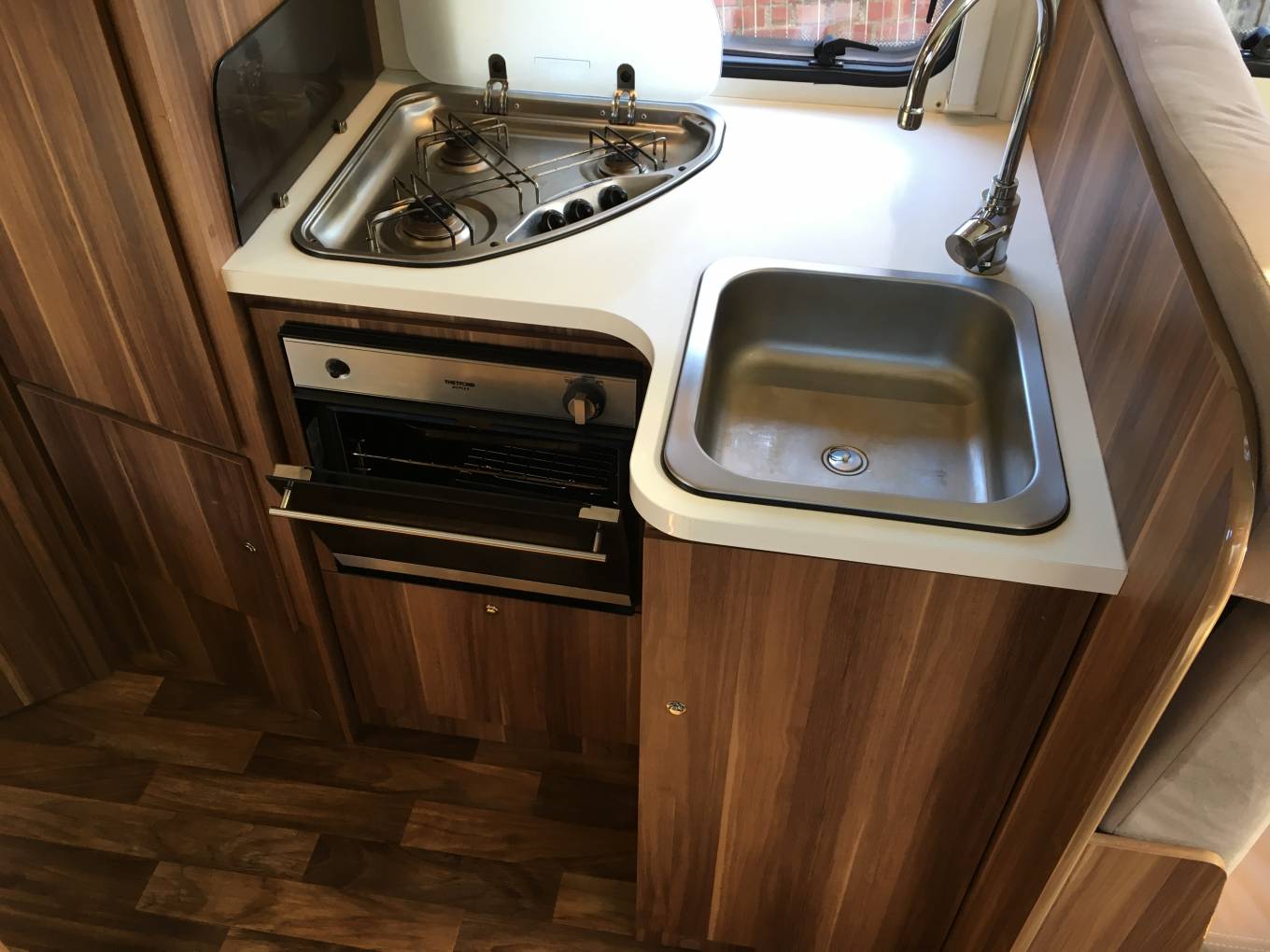 chrome mixer tap, a three gas burner hob and below a Thetford Duplex