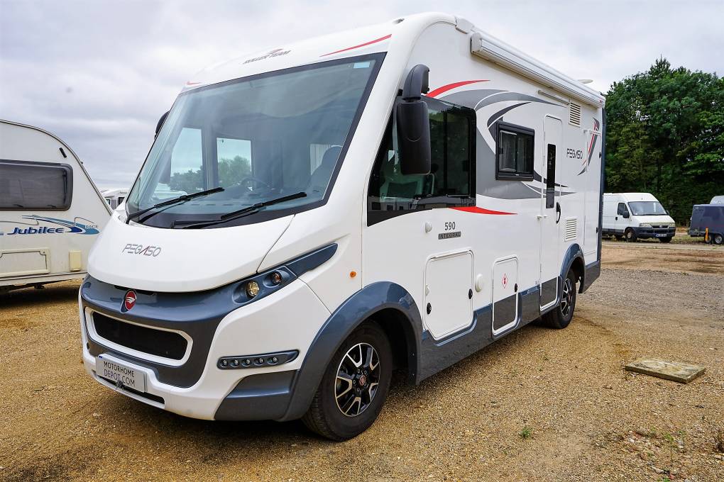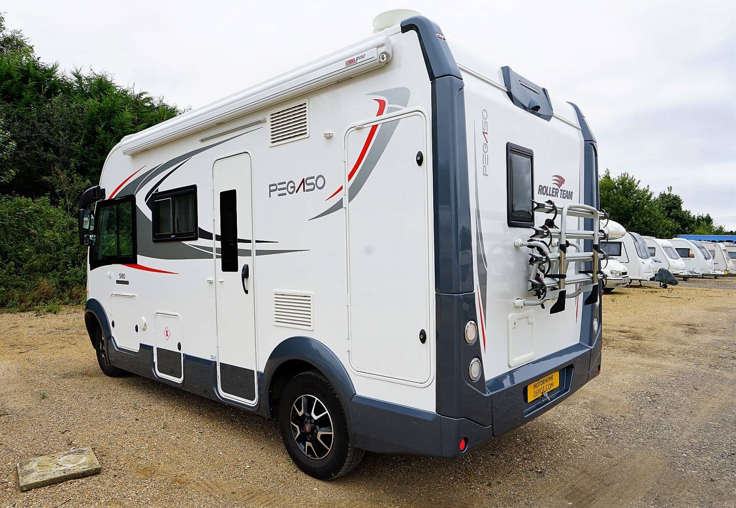 2019 Roller Team Pegaso 590 Integral - Automatic - Compact 4 Berth A Class with large rear Washroom, Dropdown bed, Spacious L shaped Lounge and 4 seat belts. Features Solar Panel, 4 Bike Rack, Alarm, Tracker, Reversing Camera, WIFI, TV, Large Washroom with Separate Shower, Full height External Storage locker, Alloy Wheels, Driver Door (Cab).