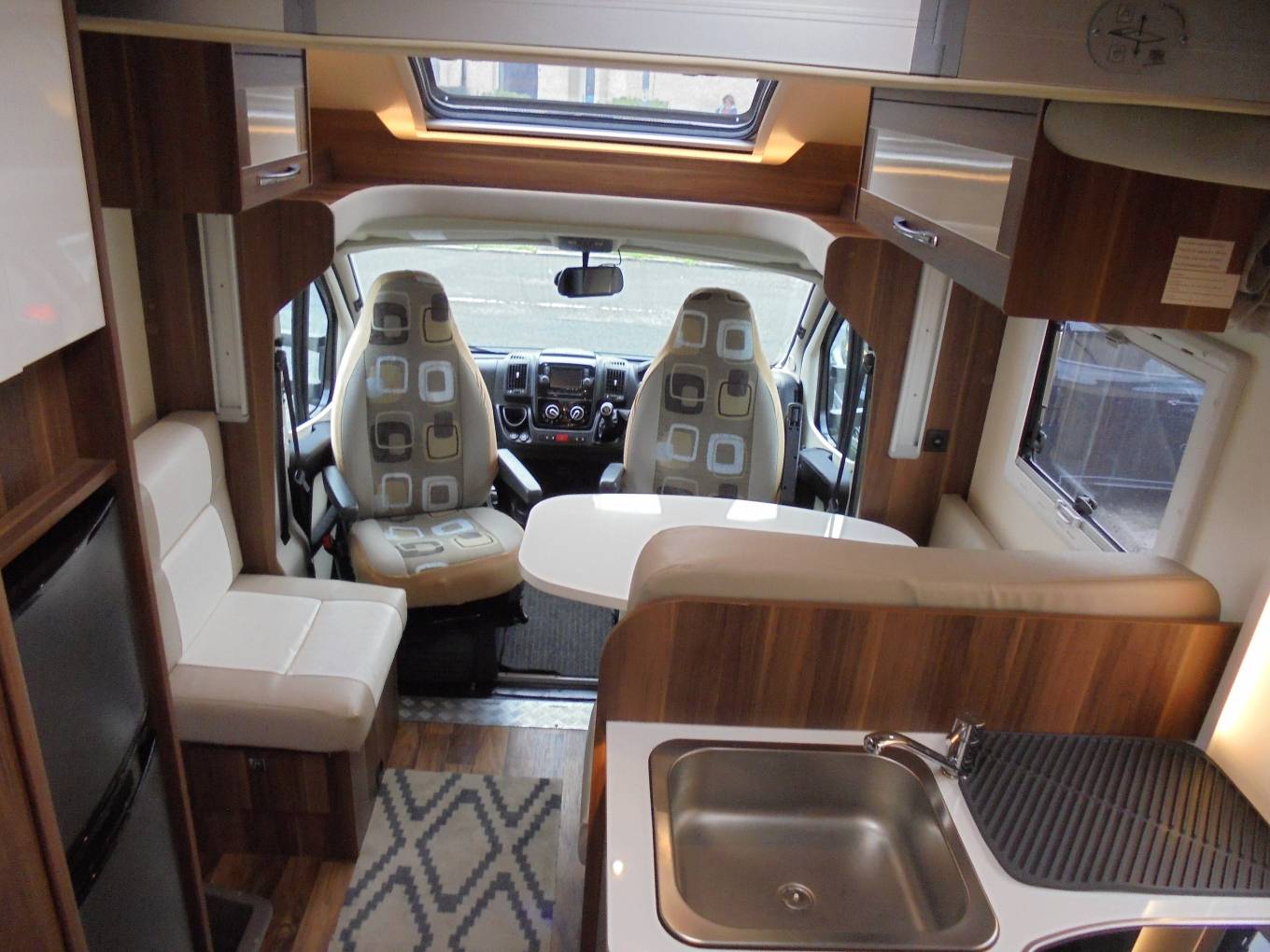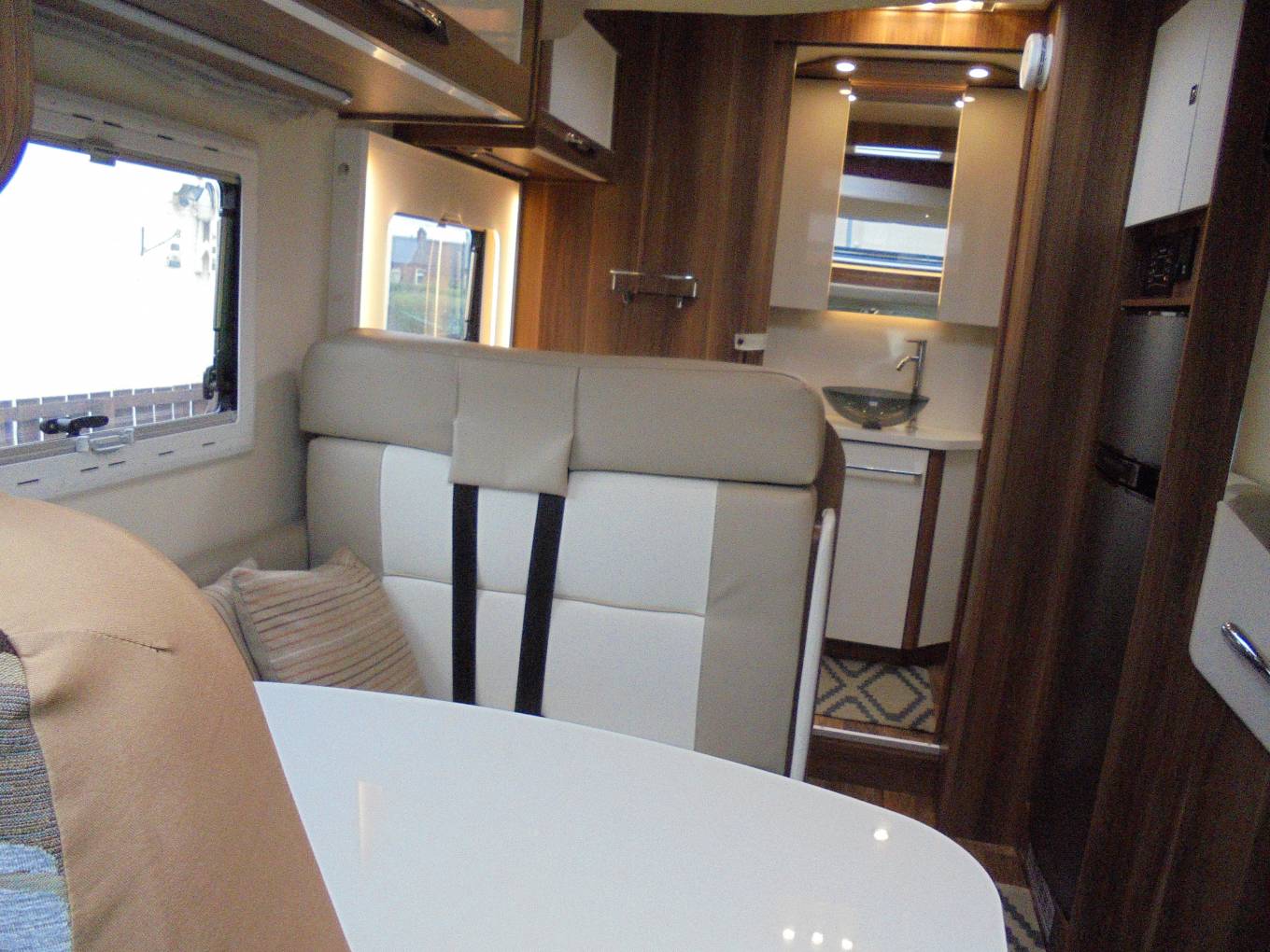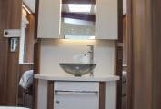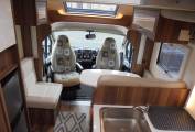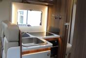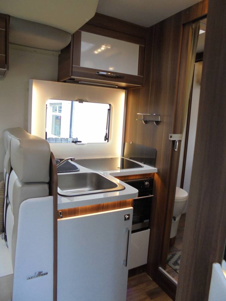 In the middle of the van is a good sized kitchen with a 3 burner gas hob, oven/grill and large fridge/freezer.At the front of the vehicle you’ll find an L-shaped lounge dressed in Giorgia soft furnishings and leather which bounces the natural light around your motorhome making you always feel welcomed and it has the large electronic drop down bed above which is perfect to sleep 2 people while not compromising your living area and it has a large garage for all your travelling and storage requirements and comforts.