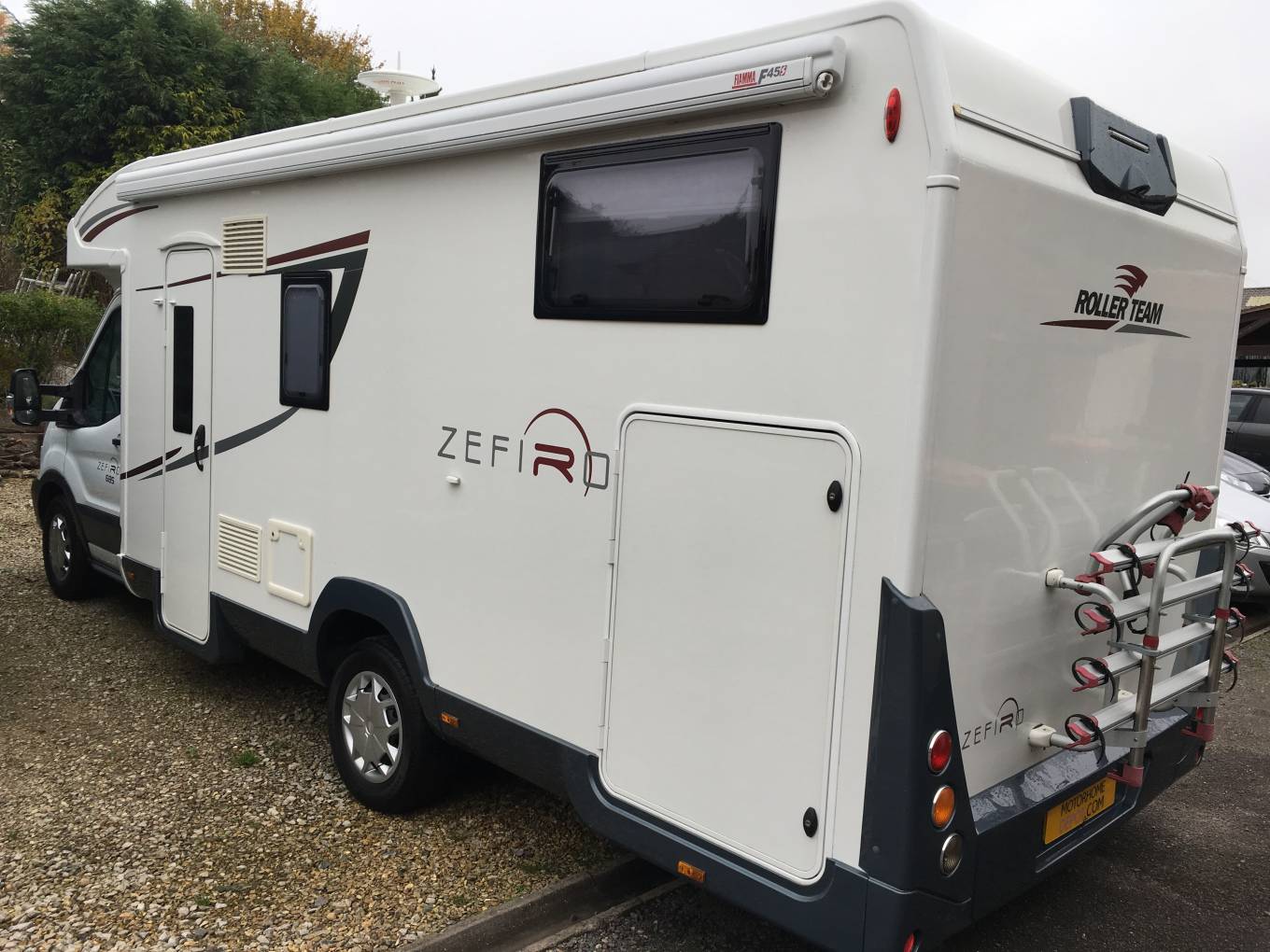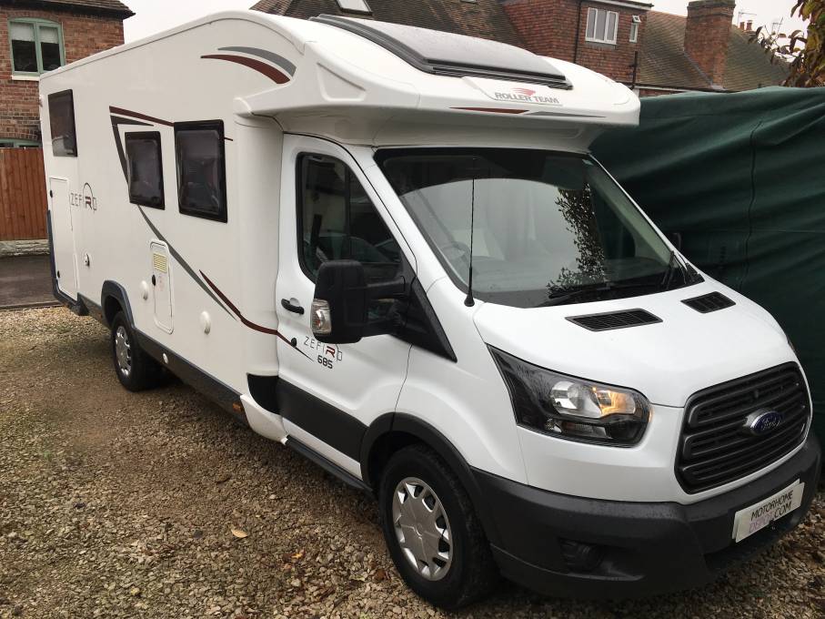 LOCATED IN NORTH WARWICKSHIRE, is this well cared for 2017 ROLLERTEAM ZEFIRO 685 motorhome, first registered in July 2017, it is a 5 berth with 5 travelling belts, low-line motorhome with the much sort after rear fixed two single beds or a double option, over a rear garage layout, so no having to make a main bed up at night time, plus this Zefiro 685 comes with an electric drop down double bed over the living area. Based on the very popular Ford Transit chassis with an economical Euro 6 compliant 2.0 turbo diesel engine and 6 speed manual gearbox. The MOT is valid until November 2022. It has only done 13,956 miles, last serviced at 8,503 miles along with regular annual habitation checks, latest done in August 2021.The large full width rear garage easily stores bicycles and offers some great storage options.