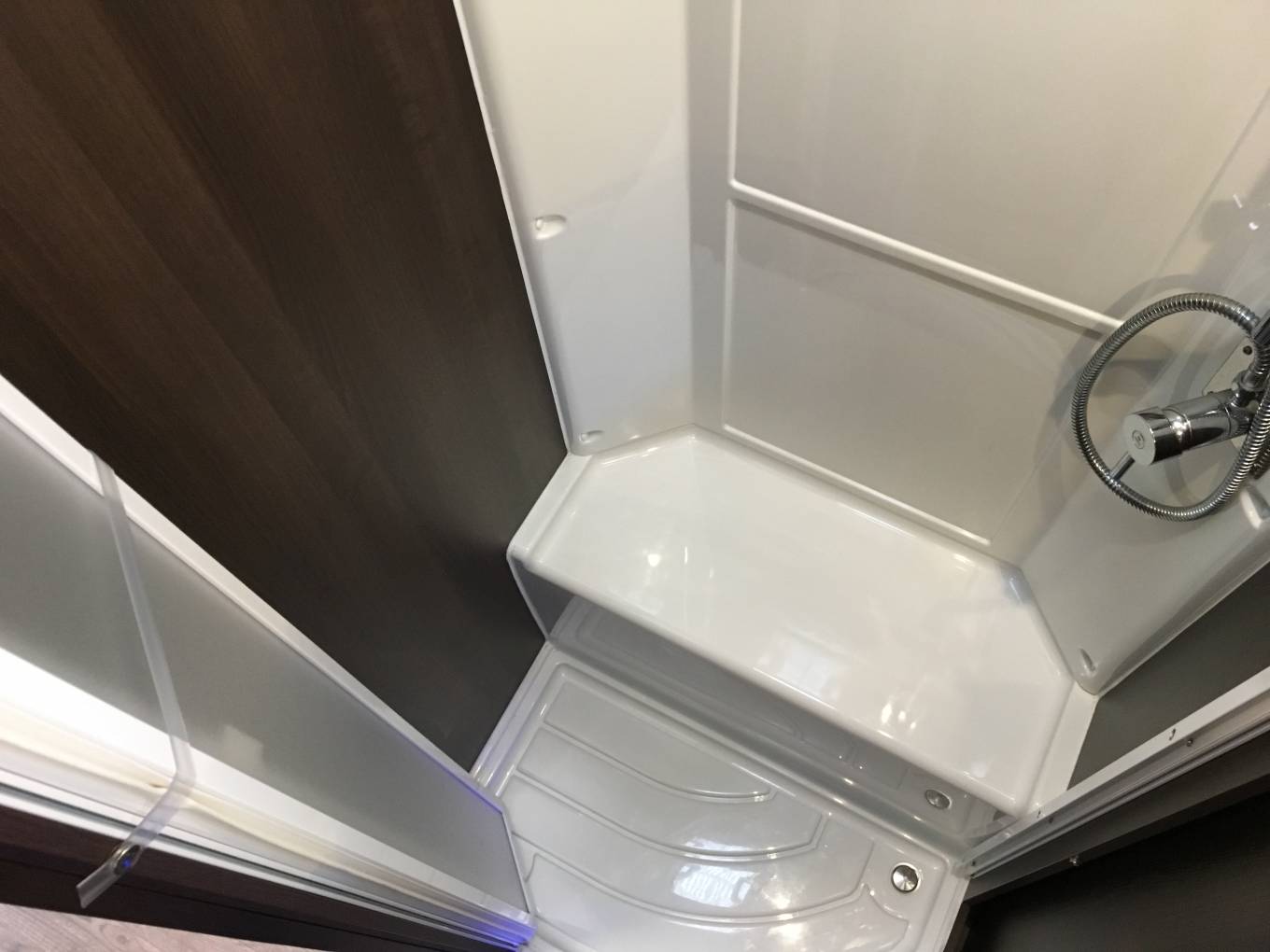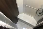 Washroom • Privacy door • Tambour screen • Separate walk-in shower cubicle • Shower bi-fold doors • Washbasin • Chrome mixer tap • Mirror • Medicine cabinet • Thetford swivel cassette toilet with electric flush • Opaque opening window.
