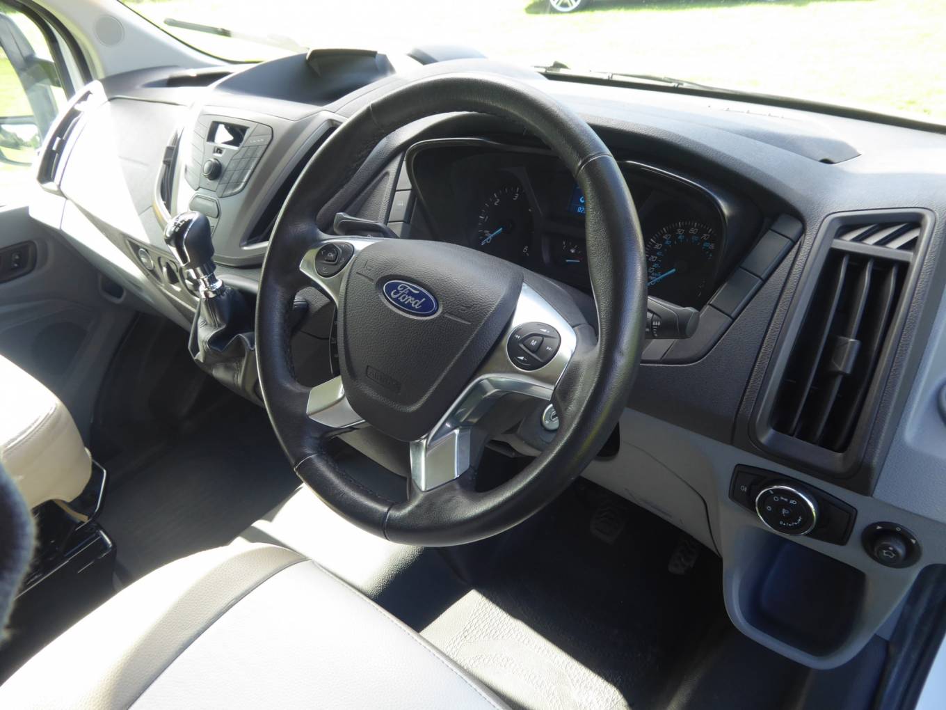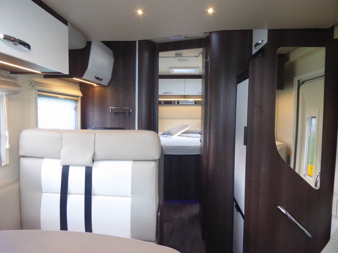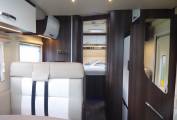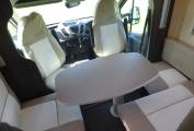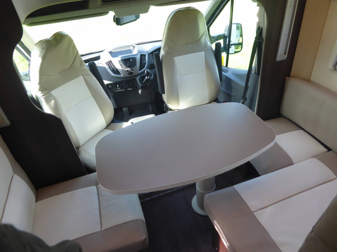 Behind the drivers cab position is a dining and leisure area with a L-shaped seating (with two additional forward facing seat belts) and table, plus an additional side seat behind the passenger cab seat, that is well lit by the surrounding windows and over cab skylight.