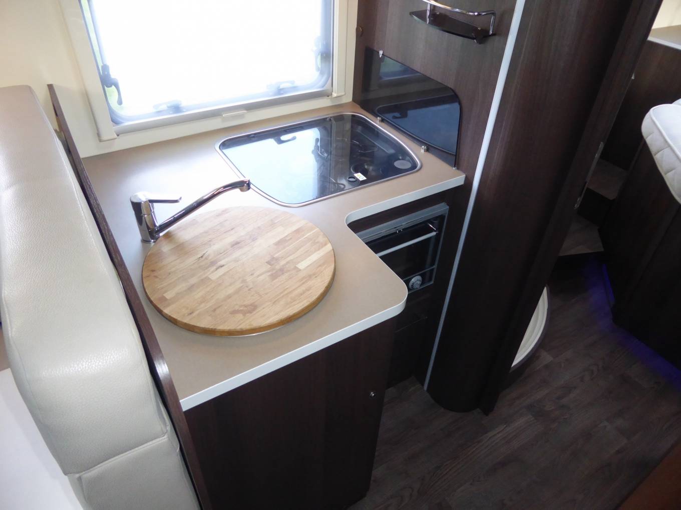 Conveniently adjacent for food storage and preparation is the off side central kitchen, with a gas hob, an oven, and a sink. Opposite is a large fridge with a freezer box.