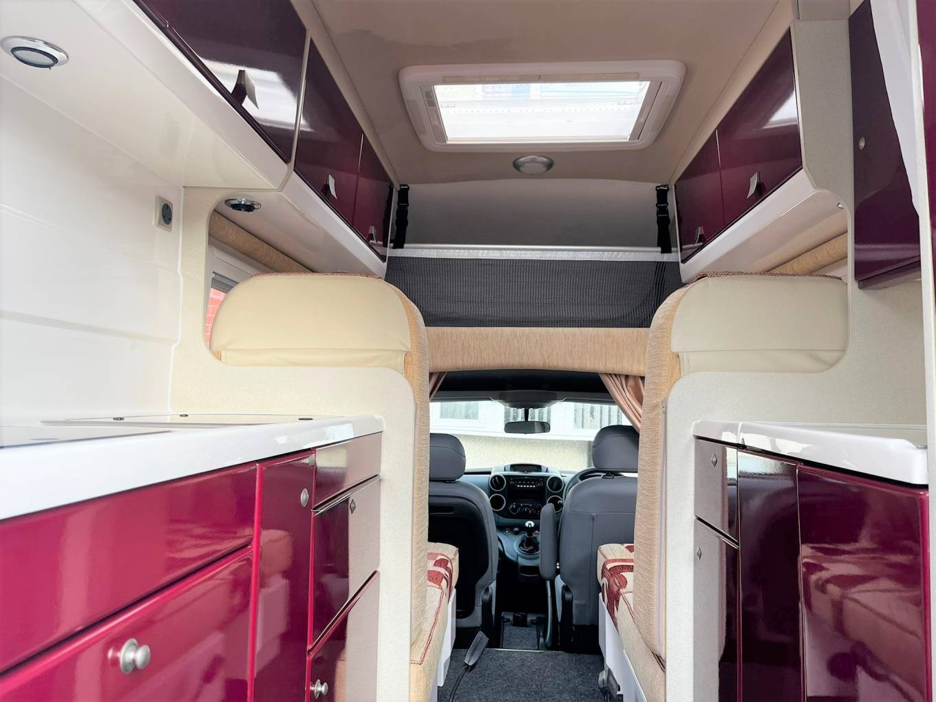 The kitchen is fitted at the rear of the van on the Near side, its facilities include fridge, grill, 2 burner gas hob and plenty of storage.